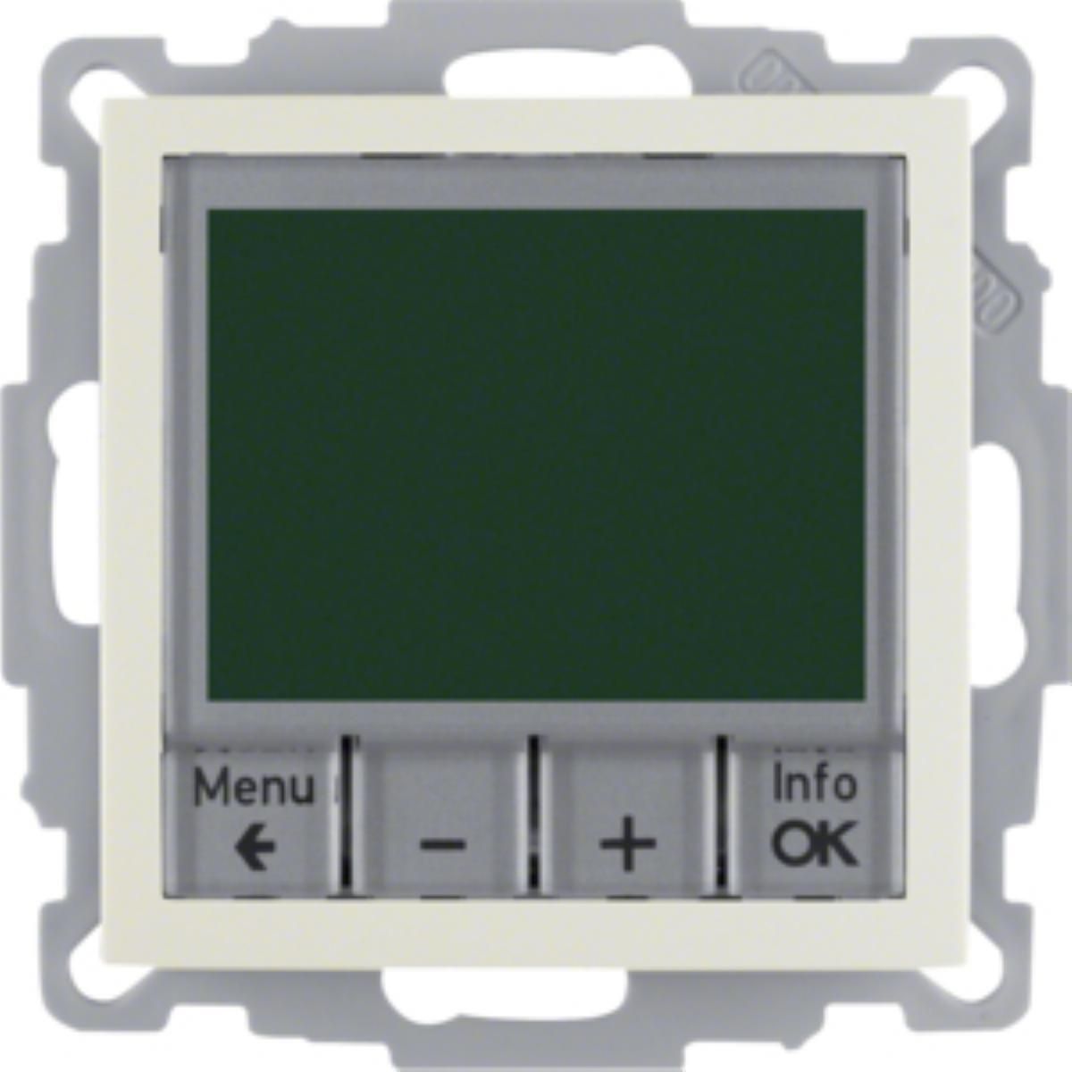 Regulator temperatury z czujnikiem napowietrznym, w kolorze Kremowy połysk, z serii B.Kwadrat, o numerze katalogowym 20448982, producenta Berker by Hager. Regulator temperatury z czujnikiem napowietrznym jest przeznaczony do regulacji temperatury w pomieszczeniach, w których zastosowano dowolny typ ogrzewania (podłogowe, grzejnikowe). Do kompletu wymagana ramka z wybranej serii. możliwość ustawienia licznika godzin pracy lub wskaźnika zużycia energii z funkcją ochrony przed zamarzaniem z funkcją ochrony zaworów zegar do czasowego sterowania zmianami temperatury z ochroną dostępu przełączanie tryb ręczny/automatyczny z wbudowanym czujnikiem temperatury program urlopowy aktywowany wg daty 3 bloki dzienne: pn.-pt., sob.-nd., pn.-nd. możliwość programowania ze zdjętym elementem obsługowym maks. 9 czasów przełączania na dzień tygodnia możliwość indywidualnego dostosowania 3 wstępnie ustawionych programów z samouczącą się krzywą grzania do ogrzewania pomieszczeń i podłogi w przypadku ogrzewania podłogowego regulacja jest możliwa poprzez temperaturę pomieszczenia i/lub podłogi do ogrzewania lub klimatyzacji możliwość wyboru regulacji metodą PWM lub 2-punktowej (wł./wył.) możliwość ustawienia czasu cykli PWM i histerezy (przy regulacji 2-punktowej) możliwość ustawienia rodzaju napędu zaworu (zamknięty/otwarty w stanie bezprądowym) możliwość podłączenia zewnętrznego czujnika temperatury