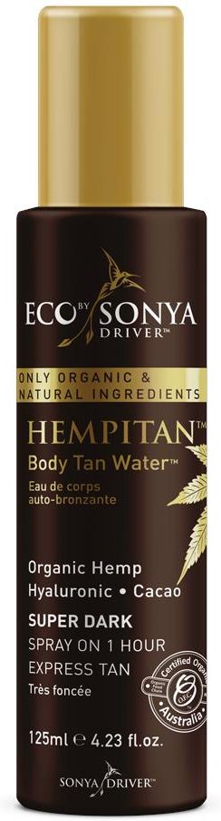 PRZEDSTAWIAMY CI certyfikowaną, organiczną wodę do opalania, dzięki której Twoja skóra będzie opalona cały rok. EFEKT JAKI uzyskasz to ciemna opalenizna, nawilżenie NASZ PRODUKT jest dla każdego rodzaju skóry STOSUJ Wstrząśnij przed użyciem. Nałóż obficie bezpośrednio na skórę i wcieraj za pomocą rąk lub naszej dwustronnej rękawicy - złota strona. Dokładnie umyj ręce po aplikacji. Aby uzyskać najlepsze rezultaty wykonaj peeling ciała co najmniej 24-48 godzin przed nałożeniem samoopalacza. Pozostaw HEMPITAN ™ na 1 godzinę przed zmyciem. Twoja opalenizna będzie się rozwijać do 24 godzin po zmyciu. Tylko do użytku zewnętrznego. Przed użyciem zalecamy test alergiczny. Unikaj kontaktu z oczami. W przypadku podrażnienia przerwij stosowanie. Przechowywać poniżej 30 ° c. TAK DLA DOBRYCH składników! ekstrakt z nasion konopi, kakao, kwas hialuronowy NIE DLA! parabenów, slsów, sztucznych barwników i aromatów, silikonów, pochodnych ropy naftowej, syntetycznych wypełniaczy. CZY WIESZ, żeekstrakt z konopi ma silne właściwości łagodzące, koi podrażnienia i doskonale odżywia skórę. Nasz produkt jest produkowany w AUSTRALII WIĘCEJ O produkcie: Pierwsza organiczna opalająca woda do ciała - HEMPITAN ™ BODY TAN WATER ™ HEMPITAN ™ to certyfikowana organiczna woda do opalania ciała, która zapewnia długotrwałą ciemną opaleniznę. Zawiera ekstrakt z nasion konopi znany ze swoich fenomenalnych właściwości nawilżających skórę. Rewolucyjny organiczny HEMPITAN Body Tan Water ™ jest wykonany wyłącznie z ekologicznych i naturalnych składników w łatwej do zastosowania formule. Fantastyczna mieszanka organicznej konopi i kwasu hialuronowego pielęgnuje skórę, jednocześnie zapewniając najbardziej trwałą opaleniznę. Porzuć chemikalia i syntetyczne składniki! Niekomodogenny - nie zatyka porów. Zapewnia długotrwały kolor. Wysycha natychmiast i pachnie niesamowicie! Twoja trwała opalenizna w wygodnym sprayu! Ekstrakt z nasion konopi jest znany ze swoich łagodzących właściwości. Koi podrażnienia skóry i utrzymuje jej naturalną wilgoć. Kakao pomaga ukoić, nawodnić i zrównoważyć skórę. Czysty kwas hialuronowy naturalnie zwiększa wilgotność, jędrność skóry.