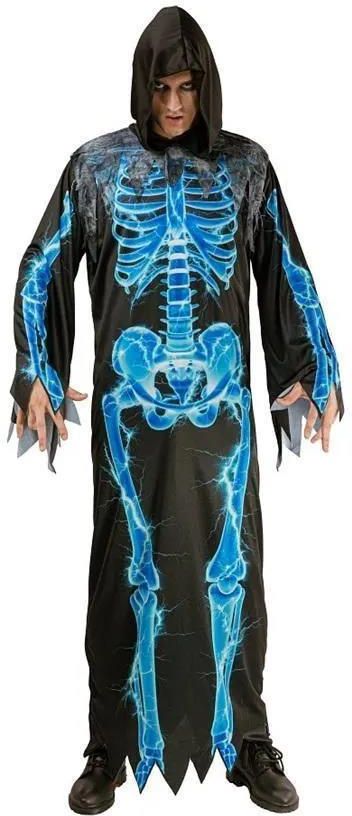 Doskonały strój żniwiarza, który sprawdzi się świetnie zarówno na imprezie Halloweenowej, jak i innej imprezie tematycznej.Wciel się w przerażającą i budzącą krew w żyłach śmierć.W skład zestawu wchodzi duża czarna, poszarpana szata z nadrukowanym elektryzującym się niebieskim szkieletem.&#9989 …