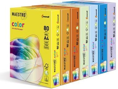 Najwyższej jakości papier biurowy, barwiony w masie celulozowej. Polecany do wydruków w drukarkach laserowych i atramentowych, a także w wysokonakładowych urządzeniach kopiujących. Zachowuje odporność barwy na starzenie. Produkcja papierów Maestro jest zgodna z normami ochrony środowiska. Ryza zapakowana w specjalną biodegradowalną przeźroczystą owijkę, która ma za zadanie chronić ryzę przed czynnikami zewnętrznymi np. wilgocią. Szeroka paleta kolorów, dostępna w 4 grupach kolorystycznych: pastelowej, intensywnej, trendy i neon. Dostępny także w miksach a'250 ark. (5 x 50 ark.) i mini ryzach a'100 ark. Papier w odcieniach pastelowych dostępny jest w gramaturze 80 g/m2 oraz 160 g/m2. W gramaturze 80 g/m2 pakowany jest po 500 arkuszy w ryzie, w gramaturze 160 g/m2 po 250 arkuszy w opakowaniu. Cechy produktu: - gramatura: 80 g/m2 - format: A4 - różne kolory - odcienie pastelowe - ryza: 500 arkuszy