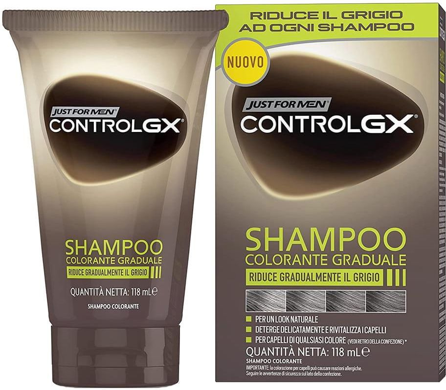 Just For Men Szampon ControlGX 118ml Just For MenSzampon Control GX Shampon, który stopniowo redukuje siwe włosy, pozostawiając naturalny wygląd.Oczyszcza, pielęgnuje i rewitalizuje włosy, pozostawiając naturalny wygląd i subtelne rezultaty. Ulepszona formuła zawiera aloes i olej kokosowy, dzięki czemu włosy są mocne i zdrowe. Nasz produkt jest wyprodukowany w USA Czy Szampon GX® pozwala pozbyć się 100% siwych włosów? Produkt nie jest zaprojektowany do pokrycia 100% siwizny, dzięki czemu efekty wyglądają naturalnie. Niektórzy mężczyźni, w zależności od typu włosów i preferencji, mogą osiągnąć pełne pokrycie przy częstym użyciu, ale ogólnie Szampon Control GX® jest zaprojektowany tak, aby subtelnie i stopniowo zredukować siwiznę z każdym myciem. Im częściej go używasz, tym szybciej zobaczysz wyniki. Gdy osiągniesz preferowany poziom redukcji siwizny, możesz zmniejszyć częstotliwość użycia, aby utrzymać pożądany kolor. Czy Szampon Control GX® nadaje się do wszystkich odcieni? Just For Men Szampon Control GX® został specjalnie opracowany do jasnych odcieni i najlepiej nadaje się do odcieni od blondu,jasny brąz aż do średniego brązu. Nie stosować na włosy rozjaśniane, rozjaśniane lub farbowane. W naszej ofercie znajdziesz również Szampon i Odżywka Control GX® najlepiej nadają się do włosów w odcieniach od średnio brązowego do czarnego. Wyniki mogą się różnić w przypadku włosów naturalnych blond lub rudych. Nie stosować na włosy rozjaśniane, rozjaśniane lub farbowane. Sposób użycia: Używaj jak zwykłego szamponu, aż osiągniesz pożądany efekt (zazwyczaj w ciągu 2-4 tygodni), a następnie używaj kilka razy w tygodniu, aby utrzymać efekt.Pozostaw szampon na włosach przez 1-2 minuty podczas kąpieli.Pamiętaj, aby zawsze przeprowadzić test alergiczny na skórze 48 godzin przed użyciem.