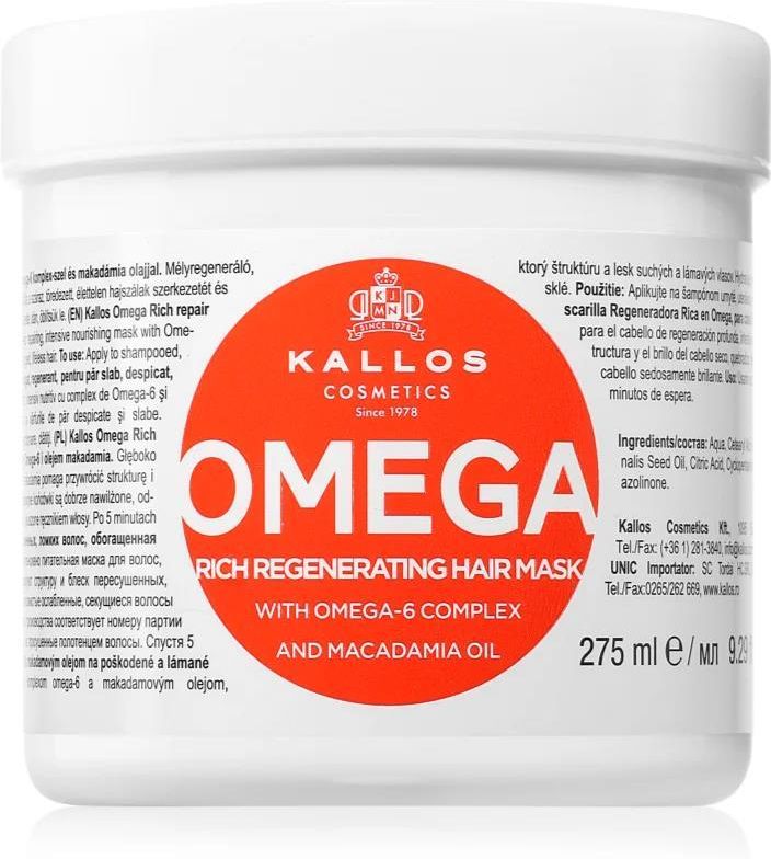 Kallos KJMN Professional Omega, 275 ml, Maseczki do włosów dla kobiet, Masz poczucie, że Twoje włosy wymagają intensywniejszej pielęgnacji niż ta, którą potrafią zapewnić odżywki lub balsamy? Maska do włosów Kallos KJMN Professional Omega doskonale wzbogaci Twoją rutynę pielęgnacyjną. Dzięki wysokiemu stężeniu substancji aktywnych skoncentrowanych na rozwiązaniu konkretnych problemów, przywraca włosom zdrowie i piękno. Wnika głęboko do włókien włosów, wzmacnia je, intensywnie odżywia, wspiera ich regenerację i wygładza ich powierzchnię, dzięki czemu pozostają wyjątkowo miękkie w dotyku pełne blasku i bardziej odporne na uszkodzenia. Właściwości: intensywnie nawilża regeneruje włosy na całej długości nadaje włosom olśniewający blask włosy są miękkie w dotyku odbudowuje strukturę włosów Skład: olejek makadamia – jest bogaty w nienasycone kwasy tłuszczowe, odżywia skórę głowy i włosy, wzmacnia i pomaga utrzymać w nich nawilżenie, wygładza i przeciwdziała puszeniu, zmiękcza i ułatwia układanie Sposób użycia: Pozostaw na włosach tyle czasu, ile podano na opakowaniu, a potem dokładnie spłucz.