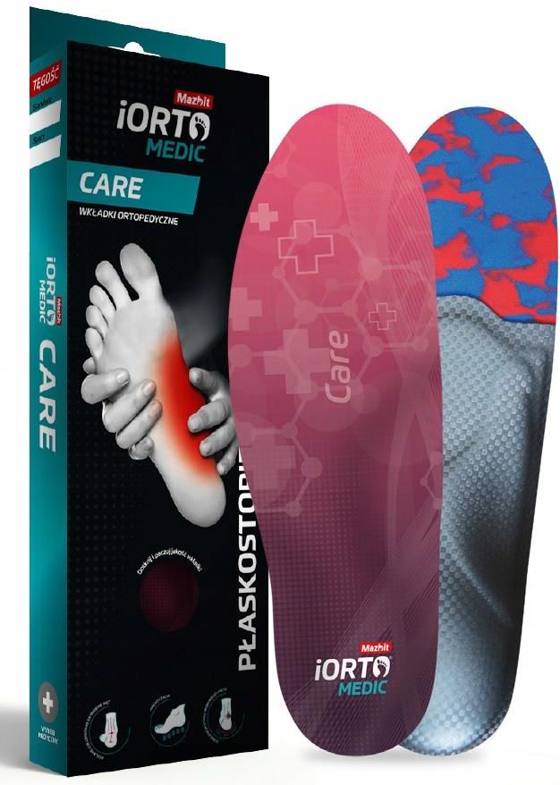 Wkładki ortopedyczne do butów Wkładki ortopedyczne do butów stosuje się, aby zapewnić wsparcie i komfort dla stóp i kręgosłupa. Wkładki mogą pomóc w różnych dolegliwościach stóp, takich jak płaskostopie, halluksy, ostroga piętowa, czy koślawość stawu palucha. Zapewniając amortyzację i pochłanianie wstrząsów, zmniejszają obciążenie całego ciała wynikające z nieprawidłowej postawy. Wkładki ortopedyczne są projektowane i dopasowywane do dokładnego kształtu stopy człowieka dla maksymalnej skuteczności. Zapewniają one wsparcie dla łuku przedniego i poprzecznego stopy, pomagając w poprawieniu równowagi. Wkładki ortopedyczne są aktywne przy każdym kroku, dzięki czemu są znacznie wygodniejsze w noszeniu niż tradycyjne wkładki lub same buty, zapewniając lepszy ogólny komfort podczas chodzenia lub stania przez cały dzień. Dzięki wkładkom korygującym postawę można cieszyć się większą stabilnością podczas stania lub chodzenia, jednocześnie zmniejszając obciążenie stóp. Właściwości wkładek CARE Standard IO70 Dynamiczne wsparcie łuku stopy Aktywacja mięśni strzałkowych Skuteczna stabilizacja pięty Amortyzacja odciąża stawy kolanowe i kręgosłup. Zaleca się stosowanie wkładek szczególnie przy płaskostopiu podłużnym, koślawości lub szpotawości stóp.