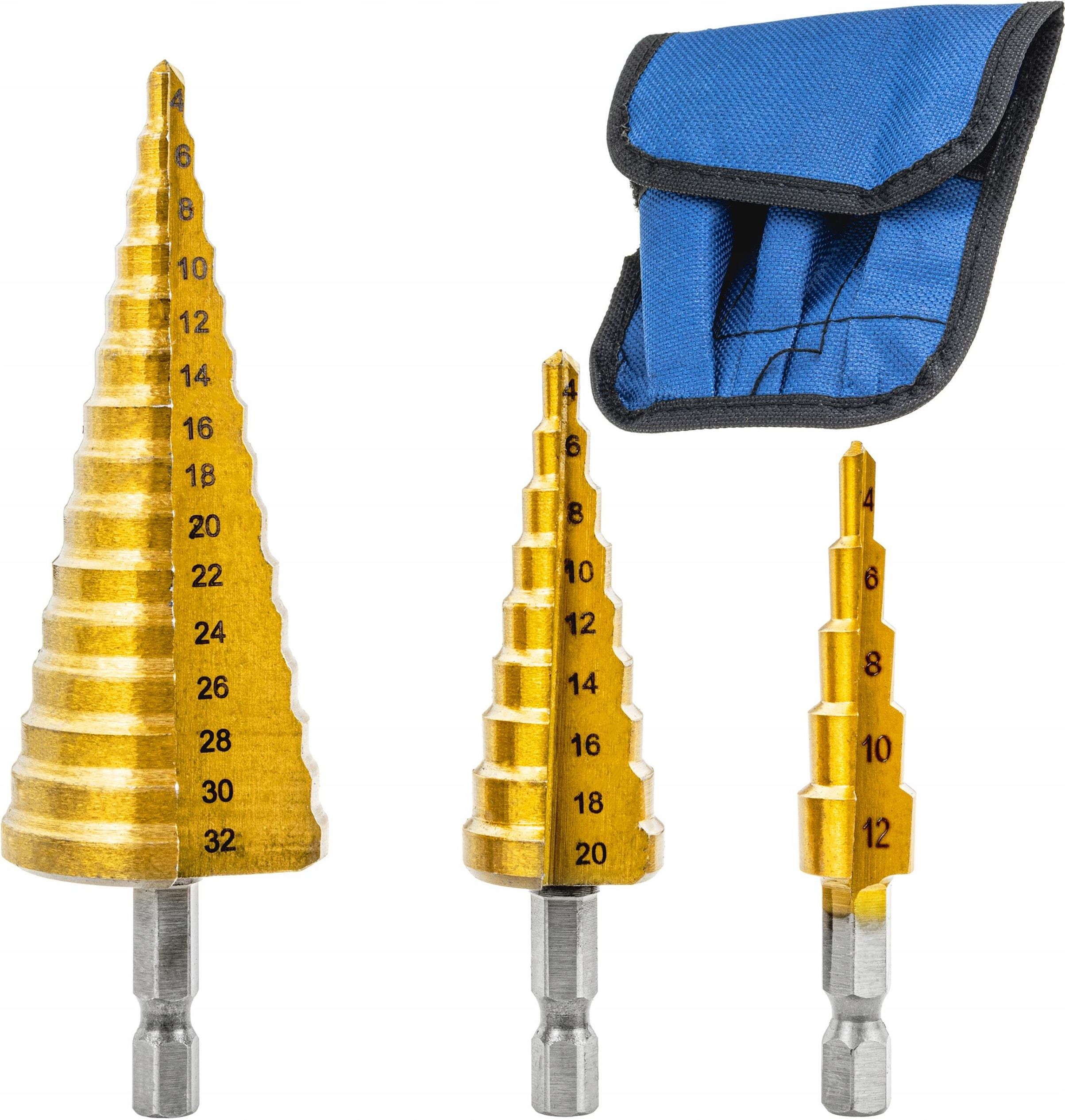 WIERTŁA STOŻKOWE STOPNIOWE DO METALU DREWNA PLASTIKU BLACH 4-32 MM HEX V06016_1 OPIS PRODUKTU: Zestaw wierteł stopniowych stożkowych, wykonane z wysokogatunkowej stali szybkotnącej HSS + TYTAN. Przeznaczone do metali , blach stalowych cienkościennych, tworzyw sztucznych. CECHY PRODUKTU: Szlifowane Wiertła są pokryte powłoką z tytanu co przedłuża ich żywotność sześciokrotnie w porównaniu z normalnymi wiertłami HSS. Laserowo wycięta numeracja pozwala na kontrolowanie wielkości otworu podczas wiercenia. Chwyt cylindryczny, szczególnie przydatny do wszystkich uchwytów wiertarskich z wieńcem zębatym i szybko mocującym DANE TECHNICZNE: Materiał: Stal szybkoschnąca HSS + powłoka tytanowa Zakres wiercenia: 4 - 12 mm, 4 - 20 mm, 4 - 32 mm Stopniowanie: co 2 mm Mocowanie: hex Kolor: złoty Ilość: 3 sztuki Etui w zestawie *przykład zastosowania