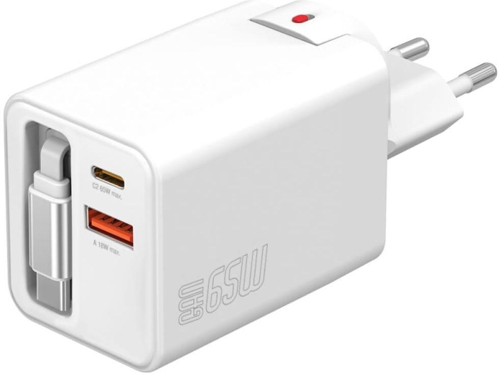 Ładowarka sieciowa 4smarts 65W GaN USB-C + USB z kablem zwijanym USB-C Ładowarka sieciowa GaN Flex Jojo 65W w kolorze białym to nowoczesne i niezwykle praktyczne rozwiązanie stworzone z myślą o użytkownikach, którzy cenią wysoką moc, kompaktową formę i wygodę w codziennym ładowaniu wielu urządzeń. Dzięki zastosowaniu innowacyjnej technologii GaN (azotek galu) oferuje wyjątkową sprawność energetyczną przy zachowaniu niewielkich rozmiarów i niskiej emisji ciepła, co przekłada się na szybkie, bezpieczne i stabilne ładowanie. Wyposażona w kilka portów, w tym USB-C Power Delivery o mocy do 65 W, ładowarka bez trudu zasila nawet laptopy, tablety i smartfony jednocześnie. Inteligentny system rozdzielania mocy automatycznie dopasowuje parametry do podłączonych urządzeń, zapewniając optymalną prędkość ładowania bez ryzyka przeciążenia. Charakterystycznym elementem konstrukcji jest zintegrowany, zwijany przewód w formie praktycznego mechanizmu typu „jojo”, który eliminuje problem splątanych kabli i ułatwia transport. Kompaktowe rozmiary i minimalistyczny design sprawiają, że ładowarka idealnie sprawdza się zarówno w domu, jak i w podróży. Dane Techniczne Model 4smatrs GaN Flex Jojo 65W Kolor Biały Technologia GaN (Gallium Nitride) – wysoka sprawność energetyczna, niska emisja ciepła Porty 2 × USB-C (Power Delivery 3.0), 1 × USB-A (Quick Charge 3.0) Moc maksymalna do 65 W Parametry USB-C PD 5V/3A, 9V/3A, 12V/3A, 15V/3A, 20V/3.25A (max 65 W) Parametry USB-A QC 5V/3A, 9V/2A, 12V/1.5A (max 18 W) Funkcja ładowania jednoczesnego Tak – inteligentne rozdzielanie mocy między portami Zintegrowany przewód Mechanizm zwijany „Jojo” (USB-C, do 65 W) Napięcie wejściowe 100–240 V ~ 50/60 Hz Zabezpieczenia OVP, OCP, OTP, SCP – ochrona przed przepięciem, przeciążeniem, przegrzaniem i zwarciem Wymiary ok. 65 × 65 × 30 mm Waga ok. 150 g Kompatybilność Laptopy, tablety, smartfony, powerbanki, konsole przenośne i inne urządzenia USB-C/USB-A Certyfikaty CE, RoHS, FCC