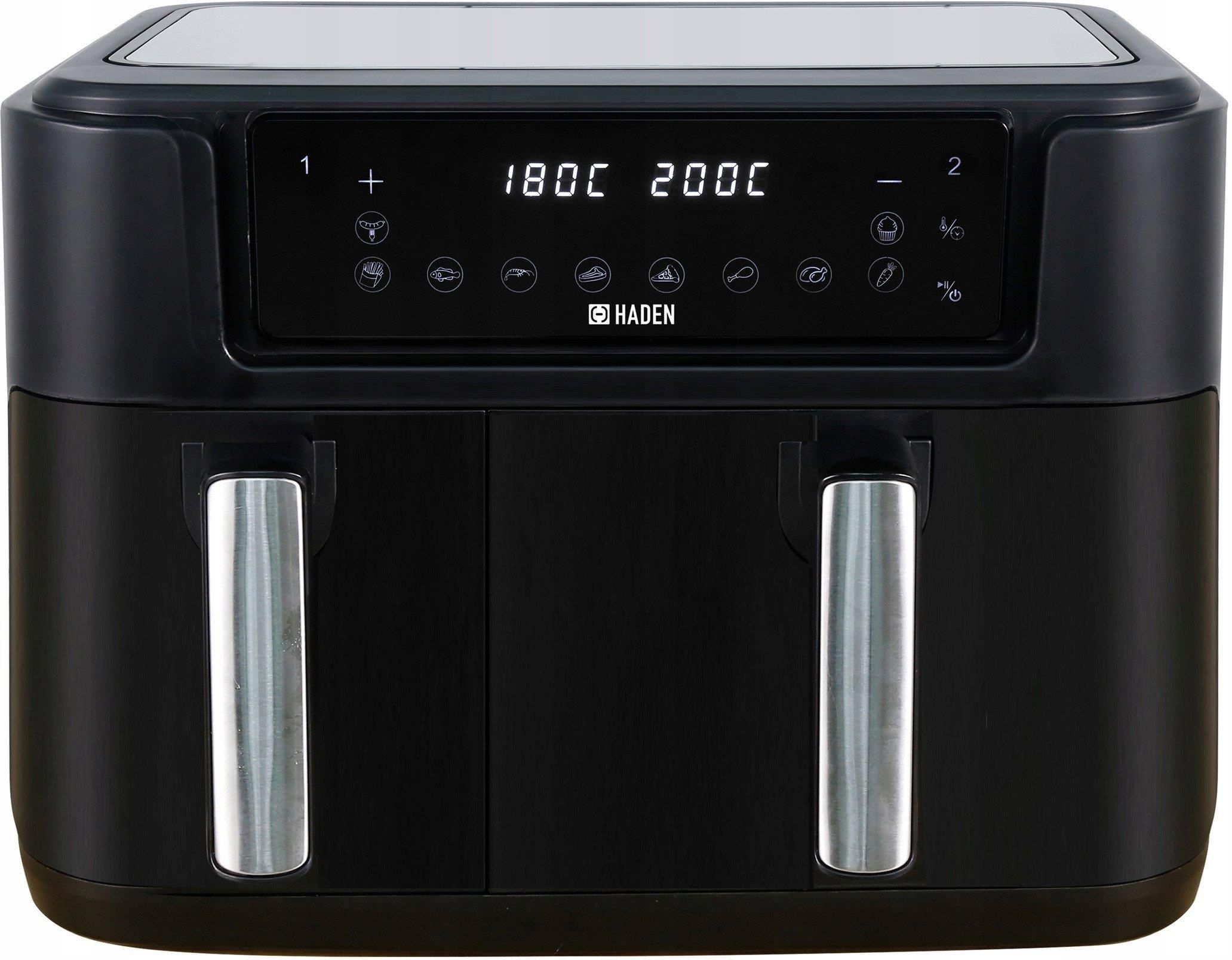 Haden – brytyjska marka z tradycją od 1958 roku Zdrowe gotowanie dla całej rodziny Air Fryer Haden 9,5 L pozwala przygotować ulubione potrawy szybko, zdrowo i z minimalną ilością tłuszczu. Dzięki technologii cyrkulacji gorącego powietrza potrawy są chrupiące na zewnątrz i soczyste w środku – bez konieczności smażenia w oleju. Urządzenie zużywa mniej energii niż tradycyjny piekarnik, co oznacza oszczędność czasu i pieniędzy. Frytkownica o mocy 2400 Wat i zakresie temperatur 60 – 200 °C pozwala szybko przygotować wszystkie potrawy, zachowując ich smak i nadając wyjątkowej chrupkości. Urządzenie zużywa znacznie mniej energii niż klasyczny piekarnik i nie wymaga używania tłuszczu. Dlaczego warto wybrać Haden Air Fryer 9,5 L? • Pojemność 9,5 L – idealna na rodzinne obiady lub gotowanie dwóch potraw jednocześnie. • Dwa kosze (3,5 L i 6 L) – różne porcje w tym samym czasie. • Funkcje „Sync Finish” i „Dual Cook” – zsynchronizuj kosze, aby potrawy były gotowe razem, lub ustaw ten sam program dla obu komór. • 10 programów automatycznych – proste gotowanie jednym dotknięciem. • Moc 2400 W i zakres 60–200°C – szybkie nagrzewanie i precyzyjna kontrola temperatury. • Łatwe czyszczenie – wyjmowane, nieprzywierające kosze i tacki. • Nowoczesny design – elegancka czerń i panel dotykowy LED, który wygląda świetnie w każdej kuchni. • Bezpieczeństwo – automatyczne wyłączanie i antypoślizgowe nóżki. Specyfikacja techniczna Moc: 2400 W Pojemność całkowita: 9,5 L Kosze: 3,5 L + 6 L Programy automatyczne: 10 Timer: 0–60 minut Zakres temperatur: 60–200°C Panel: dotykowy LED Wymiary urządzenia (W x S x G): 37 × 40 × 44 cm Waga netto: 7 kg Kolor: czarny Długość kabla: 1 m Funkcje dodatkowe: Sync Finish, DualCook, Automatyczne wyłączanie Cechy produktu Kolor Czarny Materiał PP Liczba koszy 2 / 3,5L i 6L Kształt kosza Prostokątny Pojemność 9,5 L Termostat Elektroniczny Timer 0 – 60 minut Zakres temperatur 60 – 200 °C Programy automatyczne Tak Liczba programów auto 10 Wizjer Nie Nóżki antypoślizgowe Tak Funkcje dodatkowe - Match cook - Sync finish - Automatyczne wyłączanie Zawartość zestawu • Frytkownica Haden 9,5L Dual Air Fryer • 2 kosze z tackami grillowymi (3,5 l i 6 l) • Instrukcja obsługi • Oryginalne opakowanie producenta