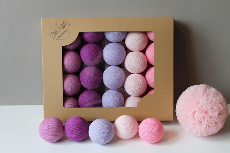 Delikatne róże i jasne fiolety - w dzień raduje serce małej dziewczynki, a w nocy - koi do spokojnego snu. Komplet składa się z kul w kolorach light pink, soft pink, lavender, magneta oraz light magenta.