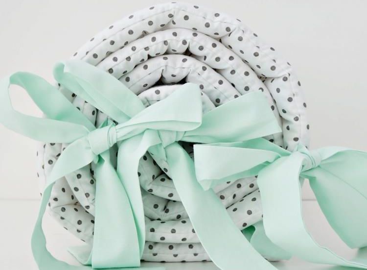 Ochraniacz w kolorze białym w szare kropki z miętowymi kokardami wykonany ze 100% bawełny