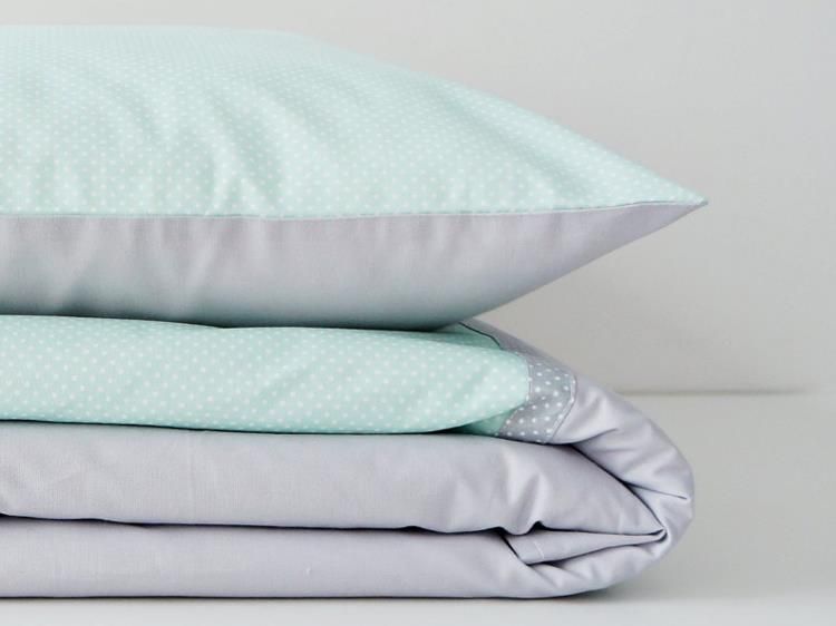 Komplet pościeli w kropeczki w kolorze szaro-miętowym.
