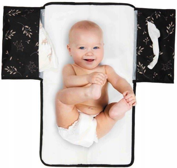 5626468 Przenośny przewijak/organizer 3w1 Dooky Black Przenośny przewijak/organizer 3w1 Dooky black Przenośny przewijak/organizer 3w1 Dooky to idealny towarzysz podróży. Umożliwia położenie dziecka na wygodnej, miękkiej i czystej powierzchni podczas zmiany pieluszki. Po złożeniu idealnie pasuje do torby na pieluchy. Pasek z przyciskiem zapewnia jego zamknięcie. Praktyczna konstrukcja z 2 kieszeniami zapewnia łatwy dostęp do chusteczek i pieluszek. Zestaw do przewijania składa się z: wygodnej wyściełanej maty do przewijania, zintegrowanej kieszeni na pieluchy, która może pomieścić kilka pieluch oraz zintegrowanego dozownika chusteczek dla niemowląt zapewniającego natychmiastowy dostęp do nich. Jest kompaktowy, świetnie wygląda i jest łatwy do czyszczenia wilgotną szmatką. Piękny romantyczny wzór listków na czarnym tle. • Miękki i wygodny • Rozmiar po rozłożeniu: 60 x 34 cm / rozmiar po złożeniu: 21 x 17 cm • Kieszenie na chusteczki i pieluchy • Łatwe do czyszczenia • 40% poliester 30% pianka 30% Peva • Zgodny z BSCI (np. odpowiedzialność społeczna, sprawiedliwy handel, brak pracy dzieci, przyjazny dla środowiska) • Wegański (nie użyto żadnych substancji pochodzenia zwierzęcego)