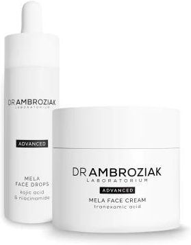 DrAmbroziak Mela Face Set – Zestaw na przebarwienia Specjalistyczny zestaw do codziennej pielęgnacji cery z przebarwieniami i niedoskonałościami z linii Advanced: Zestaw zawiera: DrAmbroziak Mela Face Drops Serum na przebarwienia 30ml Specjalistyczne serum z kwasem kojowym do codziennej pielęgnacji cery z przebarwieniami i niedoskonałościami z linii Advanced. Mela Face Drops skutecznie rozjaśnia przebarwienia różnego rodzaju, takie jak przebarwienia posłoneczne, plamy, piegi oraz blizny potrądzikowe oraz wyrównuje koloryt skóry. Kwas kojowy, roślinne ekstrakty oraz niacynamid efektywnie rozjaśniają skórę, niwelując problemy hiperpigmentacji oraz zaczerwienień. Dodatkowe przeciwbakteryjne właściwości serum wyciszają zmiany skórne oraz objawy trądziku. Pojeność 30ml DrAmbroziak Mela Face Cream Krem na przebarwienia 50ml Specjalistyczny krem do codziennej pielęgnacji cery skłonnej do nadmiernej pigmentacji, wywołanej nadmierną ekspozycją na promienie UV, procesem starzenia, stresem, zanieczyszczeniem środowiska, a także redukcji istniejących już przebarwień i niedoskonałości skóry. Mela Face Cream tranexamic acid widocznie rozjaśnia przebarwienia oraz zapobiega powstawaniu nowych plam pigmentacyjnych. Formuła kremu na bazie kompleksu kwasów, roślinnych ekstraktów oraz składników odżywczych i łagodzących skutecznie pielęgnuje skórę skłonną do przebarwień. Sprawia, że cera nabiera ujednoliconego kolorytu, odzyskuje utracony blask, wygląda świeżo i promiennie. Pojemność: 50ml