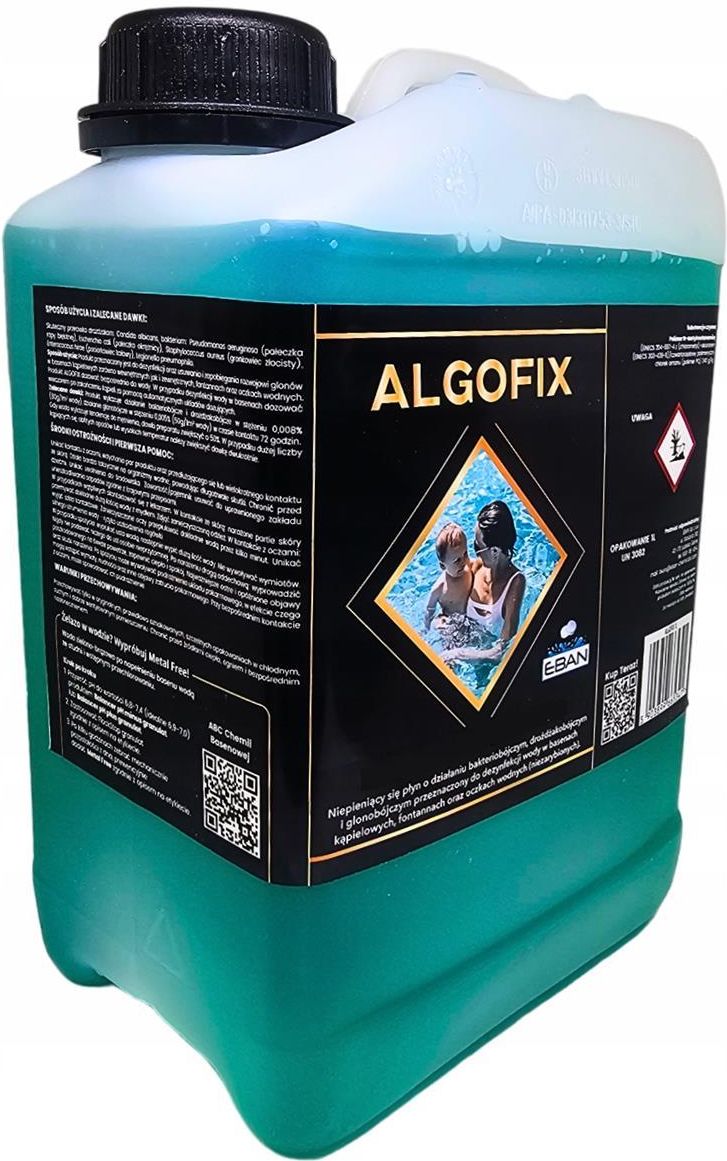 ALGOFIX 3,2KG ŚRODEK PRZECIW GLONOM WALKA Z GLONAMI EBAN ALGOFIX 3,2KG – Skuteczny środek glonobójczy do basenów, fontann i zbiorników wodnych Zadbaj o higienę wody w swoim basenie, fontannie czy oczku wodnym dzięki ALGOFIX 3,2kg – wyjątkowemu preparatowi do walki z glonami, bakteriami i drożdżakami. Ten niezawodny środek do walki z glonami skutecznie eliminuje szkodliwe mikroorganizmy, takie jak Pseudomonas aeruginosa, Escherichia coli i Legionella pneumophila, zapewniając czystość oraz bezpieczeństwo wody zarówno w basenach wewnętrznych, jak i zewnętrznych. Idealny dla każdego, kto oczekuje skutecznego zwalczania glonów w krótkim czasie! Główne zalety i korzyści Szybkie działanie – efektywna eliminacja glonów i bakterii Środek glonobójczy o szerokim spektrum – do basenów, fontann i zbiorników wodnych Skuteczne usuwanie glonów – długotrwała ochrona biologiczna Prosta aplikacja – ręczne dozowanie lub system automatyczny Uniwersalne zastosowanie – sprawdza się w każdych warunkach Jak działa Algofix? Dzięki regularnemu stosowaniu ALGOFIX zapewnisz sobie bezpieczne kąpiele oraz przejrzystość wody bez nieprzyjemnego zapachu i zielonych osadów. Zalecane dawkowanie to 100–200 ml na każde 10 m³ wody raz w tygodniu. W razie intensywniejszego użytkowania basenu lub po deszczu zaleca się zwiększenie dawki o 50% – dla jeszcze lepszego efektu. Bezpieczeństwo użytkowania ALGOFIX to chemia basenowa o silnym działaniu, dlatego należy stosować ją z rozwagą. Przed użyciem zawsze zapoznaj się z instrukcją i etykietą. Produkt jest toksyczny dla organizmów wodnych – należy unikać jego przedostania się do środowiska naturalnego. Trzymaj z dala od dzieci i przechowuj w suchym, chłodnym miejscu. Zalecenia bezpieczeństwa Unikaj kontaktu ze skórą i oczami Nie wdychaj oparów produktu Przechowuj z dala od żywności i napojów Nie czekaj, zadbaj o swój basen już dziś! Algofix to wszechstronny i wydajny preparat, który zapewnia czystość wody w basenie, eliminując glony i inne mikroorganizmy. Dzięki łatwemu dozowaniu i błyskawicznym efektom to produkt, który zapewni komfortową kąpiel w każdej chwili. Wybierz Algofix i ciesz się idealnie czystą wodą każdego dnia. Sprawdź też naszą pełną ofertę na chemię basenową – znajdziesz u nas wszystko, czego potrzebujesz, by Twój basen lśnił czystością!