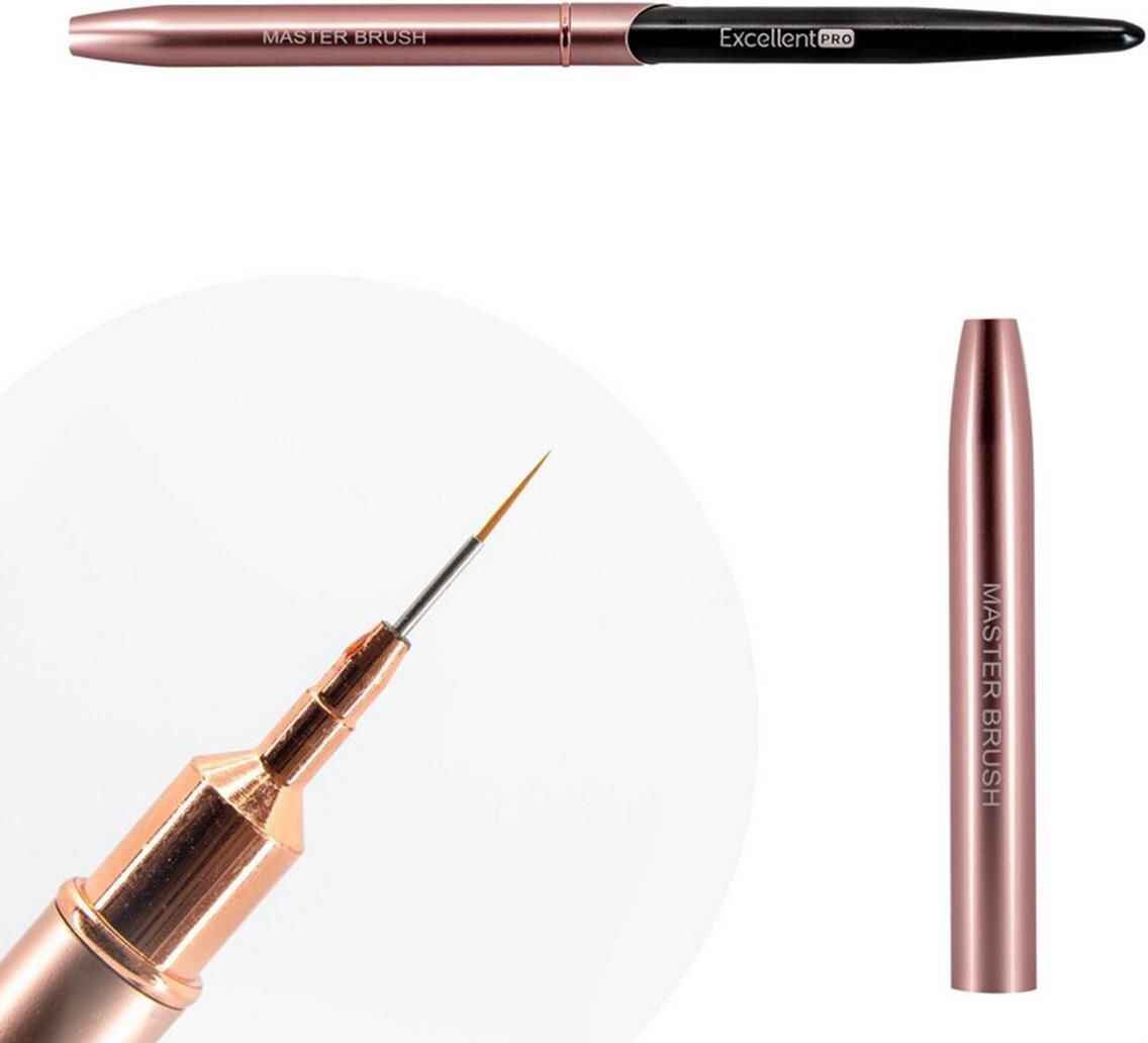 Excellent PRO Master Brush Syntetyczny Pędzelek Do Zdobień 7mm Pink Black Precyzyjny pędzelek do paznokci Excellent PRO pędzelek do zdobień z włosiem o długości 7mm. Świetnie sprawdzi się także do rozkładania żelu i poprawiania linii światła. Produkt jest wykonany z wysokiej jakości włosia syntetycznego, które cechuje się niezwykłą trwałością i odpornością na składniki chemiczne, co zapewni jego trwałość na długi czas. Zamykana skuwka zabezpiecza włosie przed ewentualnymi uszkodzeniami i zniszczeniem. Niezwykłe połączenie czerni i różowego złota czynią pędzelek nie tylko niezbędnym narzędziem ale również stylowym dodatkiem w twoim salonie lub prywatnej pracowni.