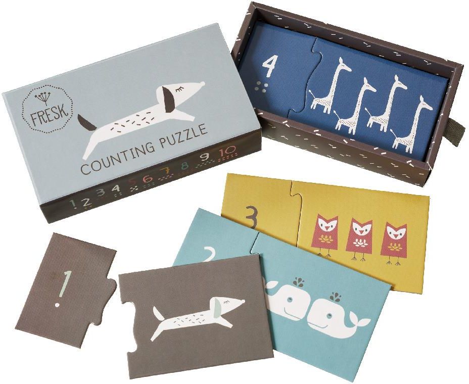 Fresk Puzzle do nauki liczenia Fresk to holenderski producent zachwycających zabawek, ubranek i akcesoriów dla dzieci produkowanych w zgodzie z ideą zrównoważonego rozwoju. Filozofią marki jest odpowiedzialne i przemyślane planowanie produkcji minimalizujące negatywny wpływ na nasze otoczenie. Fresk to połączenie uznanego wzornictwa i doskonałej jakości. Organiczne, naturalne materiały zapewniają komfort i ochronę środowiska. Charakterystyka To wspaniała przygoda uczyć się poprzez zabawę. Po prostu znajdź pasującą parę i zacznij liczyć. Puzzle sa pięknie ilustrowane, zapakowane w solidne pudełko. Wymiary pudełka: 9 x 6,5 x 4 cm. Wiek: 4+. Nieodpowiednie dla dzieci poniżej 3 lat F8640