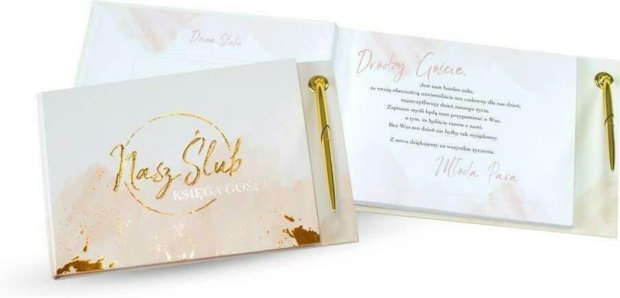 Happy Book HBP-001 Księga Gości od Kukartka Happy Book HBP-001 to unikalna prostokątna Księga Gości, stworzona z myślą o upamiętnieniu jednego z najważniejszych dni w życiu – dnia ślubu. Jest to dzień, który wywołuje wiele silnych emocji i zasługuje na szczególną oprawę. Od Kukartka otrzymujesz produkt, który stanie się doskonałym sposobem na zachowanie wspomnień z tego wyjątkowego dnia na całe życie.Księga Gości oferuje 40 białych kart na indywidualne wpisy, poprzedzone stroną tytułową oraz przestrzenią na umieszczenie zdjęcia. Wszystko to pozwoli Ci przechować wpisy, notatki, wspomnienia i mądre wypowiedzi gości, które będą Ci przypominać o tym pięknym dniu przez całe życie.Elegancja i trwałość to dwie rzeczy, którymi charakteryzuje się Księga Gości Happy Book. Każdy detal jest starannie przemyślany, a materiały najwyższej jakości. Ekskluzywna okładka, zdobiona złotem lub srebrem szczególnie przyciąga uwagę, dodając produktowi wyjątkowego blasku.Do księgi dołączono stylowy długopis, który dopełnia całość i ułatwia pozostawianie wpisów przez gości. Wymiary księgi to 265mm x 170mm, idealne do umieszczenia na stole obok księgi pamiątkowej lub na odrębnym stole dla gości.Księga gości Happy Book HBP-001 jest dostarczana w trwałym, eleganckim pudełku, co dodatkowo podkreśla jej wysoką jakość. Jest to produkt z najwyższej półki, idealny na ten wyjątkowy dzień. EAN: 5901924466420