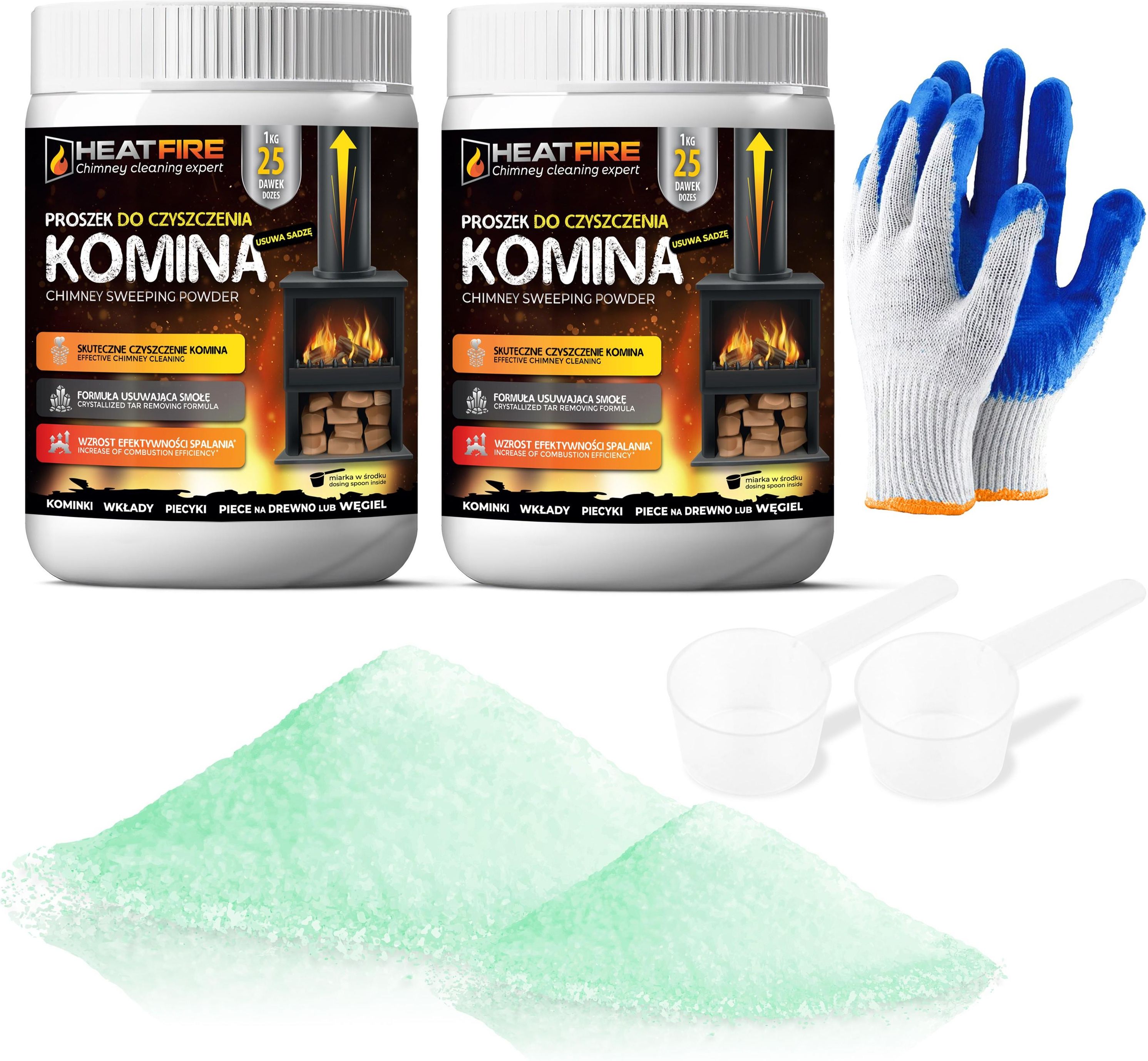 HeatFire Proszek do czyszczenia komina pieca usuwa sadzę smołę 2kg + rękawice Kalisz