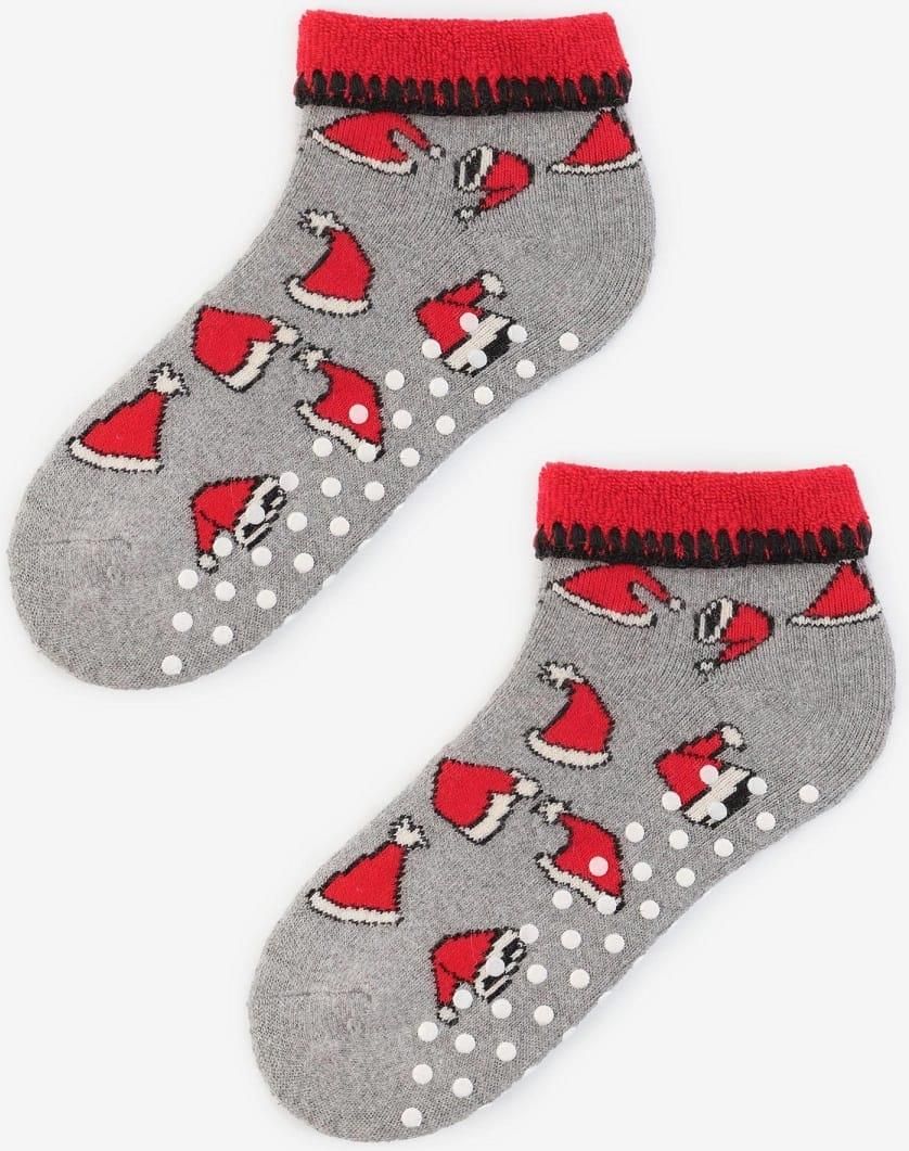 Podkreśl swoją świąteczną radość z naszymi ciepłymi damskimi skarpetkami, ozdobionymi grafiką wesołych czapek Mikołaja! Wykonane z najwyższej jakości przędzy, obiecują miękkość i komfort w każdym momencie. Wywijany, nieuciskający ściągacz gwarantuje elastyczność i idealne dopasowanie.Odkryj swoje idealne towarzystwo na mroźne, zimowe dni!