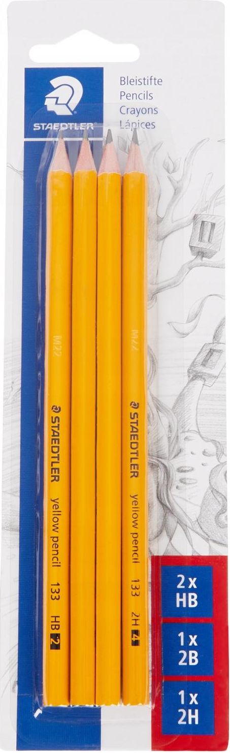 Ołówki Staedtler 4 szt wysokiej jakości ołówki do pisania, rysowania i kreślenia wyjątkowo odporne na złamania dzięki klejonemu na całej długości grafitowi mocne cedrowe drewno łatwo się temperuje idealne do szkoły i biura łatwy do wycierania i temperowania wyprodukowany zgodnie z PEFC - wytworzony z surowców drewnopochodnych, które pozyskano z certyfikowanych obszarów leśnych średnica grafitu 2 mm Zestaw zawiera 4 ołówki 2 ołówki HB, 1 ołówek 2B, 1 ołówek 2H