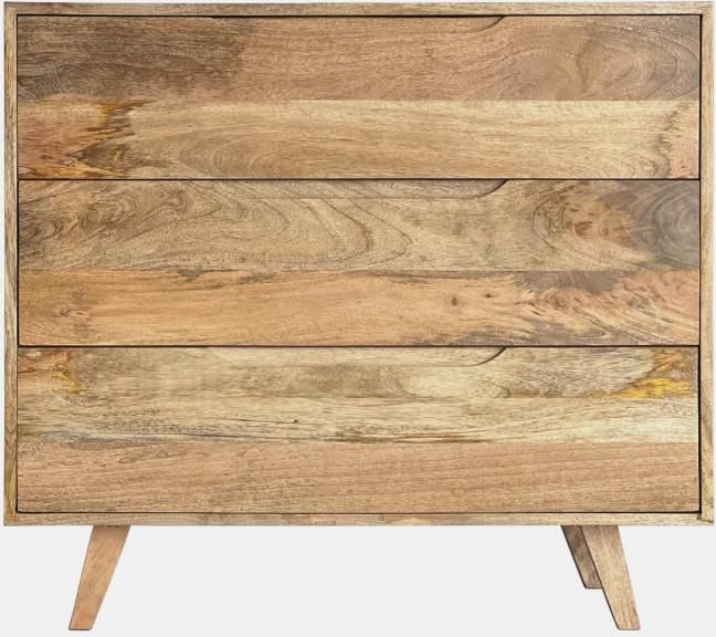 Opis produktu Komoda Ester z trzema pojemnymi szufladami to mebel utrzymany w stylistyce retro, który znakomicie odnajdzie się w przestrzeniach urządzonych w rozmaitych stylach. Pasuje do wnętrz skandynawskich, loftowych, vintage, modern i klasycznych. Nadaje się jako wyposażenie salonu, sypialni lub biura. Mebel został ręcznie wykonany z litego drewna mango. Ma matowe wykończenie, ukośne nóżki i widoczne usłojenie. Jest złożony i gotowy do użytku. Dane produktu Dla podanych wymiarów mebli obowiązuje tolerancja +- 3%. Głębokość szuflady: 34 cm Wysokość szuflady: 20 cm Szerokość szuflady: 89 cm