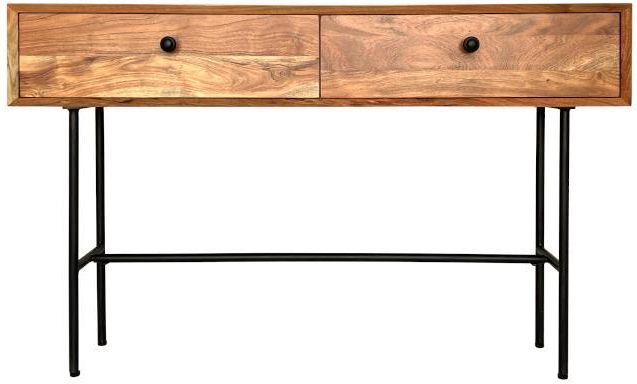 Opis produktu Konsola Olga to stylowy, idealnie wpisujący się w obowiązujące trendy wnętrzarskie mebel o wymiarach 120x75x30 centymetrów. Z uwagi na funkcjonalność i nienaganny design, znakomicie sprawdzi się w pomieszczeniach takich jak salon, sypialnia, przedpokój, a nawet biuro. Będzie pełnić funkcję praktycznego elementu wyposażenia, a także mebla, który wizualnie uatrakcyjni przestrzeń mieszkalną. Konsola Olga została wykonana z prawdziwego, litego drewna akacji, a plecy oraz dna szuflad z płyty MDF. Konsola Olga znakomicie wpisuje się w styl skandynawski, loft, vintage i modern, dzięki czemu chętnie sięgają po nią miłośnicy rozmaitych trendów wnętrzarskich. Konsola łączy w sobie ciepłe i przytulne drewno z zimnym metalem, dlatego jej wygląd przykuwa uwagę i jest doskonałym rozwiązaniem do wnętrz stylizowanych na industrialne i loftowe. Ma dwie pojemne szuflady, idealnie nadające się na podręczne przedmioty i drobiazgi. Matowe wykończenie i widoczne usłojenie dodaje meblowi atrakcyjności. Dane techniczne Montaż: do przykręcenia nogi i uchwyty Głębokość szuflad (wewnętrzna) [cm]: 24 Wysokość szuflad (wewnętrzna) [cm]: 15 Szerokość szuflad (wewnętrzna)[cm]: 55 Dla podanych wymiarów mebli obowiązuje tolerancja +- 3%
