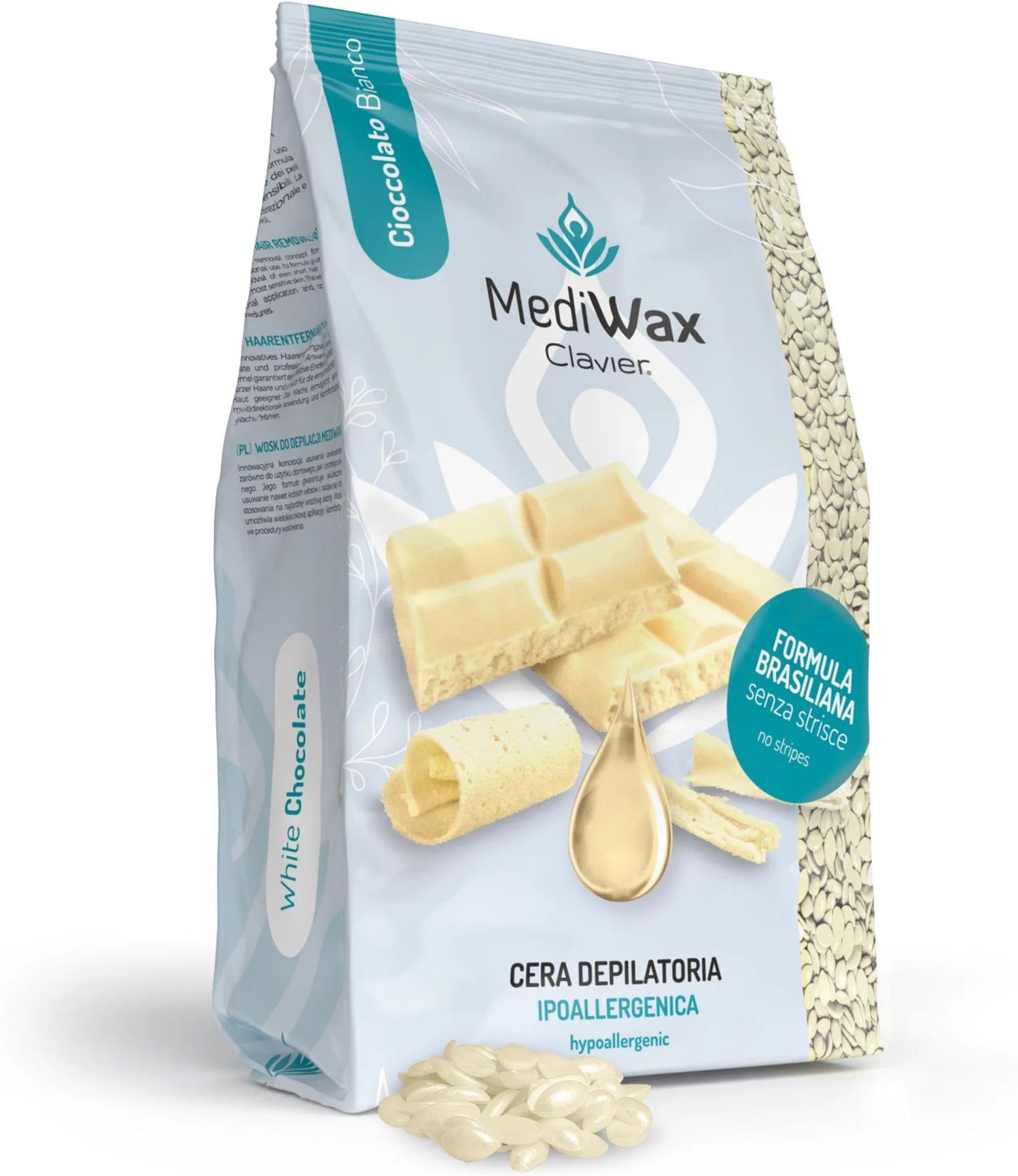 🍫 MediWax Clavier White Chocolate 1000 g - wosk do depilacji bezpaskowy, brazylijska formuła Zamień depilację w komfortowy rytuał! MediWax Clavier White Chocolate to profesjonalny wosk o brazylijskiej formule, nagrodzony na 45. Kongresie i Targach LNE. Łączy zalety wosków twardych i miękkich, skutecznie chwyta nawet bardzo krótkie włoski, a przy tym jest łagodny dla skóry. Delikatny aromat białej czekolady i plastyczna konsystencja zapewniają wygodną aplikację w domu i w salonie. 🤎 Skuteczny na krótkich włoskach Delikatny dla skóry wrażliwej Niska temperatura pracy – większy komfort Cienka warstwa i szybkie zastyganie System bezpaskowy i wielokierunkowa aplikacja Mniejsza odczuwalność bólu vs. klasyczne metody Plastyczny po zastygnięciu – świetny na miejsca trudnodostępne Gdzie i do jakich partii Nogi, ręce, plecy Pachy, linia bikini* Twarz** *W strefie bikini pracuj ostrożnie i tylko na zdrowej skórze. **Unikaj kontaktu z błonami śluzowymi. Jak używać Oczyść i osusz skórę. Rozpuść wosk w podgrzewaczu 10–20 min do kremowej konsystencji. Sprawdź temperaturę na małym obszarze. Nałóż cienką warstwę zgodnie z kierunkiem wzrostu włosków. Zerwij energicznie przeciwnie do kierunku wzrostu, trzymając skórę napiętą. Powtarzaj na kolejnych partiach, po zabiegu usuń resztki olejkiem i nałóż łagodzący preparat. Wskazówki pro Odtłuść skórę przed depilacją dla lepszego chwytu. Zachowaj 3–4 tygodnie przerwy między depilacjami dla optymalnej długości włosków. Nie nakładaj kilka razy w tym samym miejscu podczas jednej sesji. Ostrzeżenia Tylko do depilacji ciała. Unikaj oczu, błon śluzowych i okolic intymnych. Nie stosuj na skórę podrażnioną, uszkodzoną, z oparzeniami lub świeżo po opalaniu. Zawsze test temperatury i test uczuleniowy. Zbyt gorący wosk może poparzyć. Przechowuj poza zasięgiem dzieci. Odłącz podgrzewacz po użyciu.