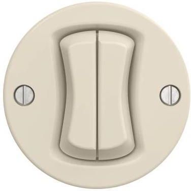 Podwójny wyłącznik schodowy = załączanie dwóch obwodów świetlnych z dwóch oddzielnych miejsc (korytarz, klatka schodowa). Dla prawidłowego działania zawsze należy stosować dwa wyłączniki jednocześnie. Okrągły wyłącznik w odcieniu beżowym. Dzięki retr