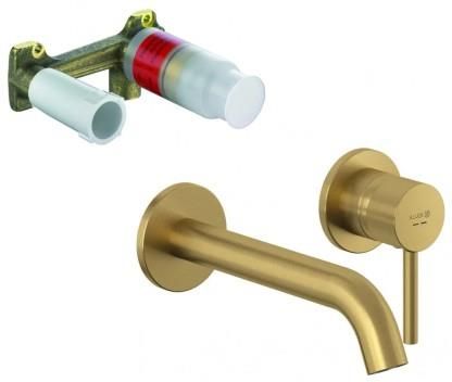 Bateria umywalkowa z elementem podtynkowym 23 cm Kludi BOZZ złoty szczotkowany 38245N076 + 38243 komplet Bateria umywalkowa ścienna podtynkowa 23 cm Kludi BOZZ złoty szczotkowany 38245N076• ścienna bateria umywalkowa• uchwyt prosty• przepływ wody 5 l/min. przy ciśnieniu 3 bar• perlator s-pointer Caché M 24 x 1• rozety o średnicy 70 mm• wysięg wylewki 230 mm• do elementu podtynkowego 38243 Element podtynkowy DN 15 KLUDI 38243• do ściennej baterii umywalkowej• do montażu podtynkowego• przepływ wody 16 l/min przy ciśnieniu 3 bar• głowica ceramiczna K-35 z ogranicznikiem wypływu gorącej wody• z osłoną zabezpieczającą na etapie montażu G 1/2• wyrównanie głębokości montażu 30 mm• przyłącze gwintowane G 1/2