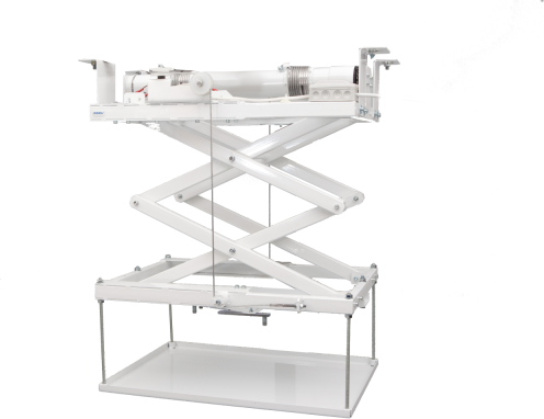 Winda RAVELL® opuszcza projektor multimedialny umieszczony nad sufitem podwieszanym do pozycji umożliwiającej projekcję. Podwyższa estetykę pomieszczenia (sala konferencyjna, szkoleniowa, dom) sprawiając, iż projektor multimedialny jest niewidoczny w momencie, gdy nie jest używany. Dodatkowo urządzenie zabezpiecza projektor przed dostępem osób niepowołanych. ZASTOSOWANIE: w wersji STANDARD do rozwiązań biznesowych - zakres pracy 0-700 cm, AKCESORIA DODATKOWE: dystansowniki montażowe o wymaganej długości, sterowanie bezprzewodowe IR lub RF, maskownica projektora. GŁÓWNE CECHY: konstrukcja windy oparta na systemie trzech ram poziomych prowadzonych przez precyzyjny pojedynczy lub podwójny wysięgnik nożycowy, ruch w górę i w dół wywoływany przez wolnoobrotową wyciągarkę wyposażoną w nawojnicę, stuprocentowa powtarzalność, cichy, płynnie działający mechanizm linowy, bezpieczeństwo i precyzja gwarantowana przez podwójny system wyłączników krańcowych, prosta obsługa, pewna i funkcjonalna konstrukcja wykonana z wysokiej jakości komponentów, wykończenie lakierem proszkowym w kolorze: czarnym, białym, srebrnym (na zamówienie możliwość wyboru innej kolorystyki z palety RAL), estetyczne i precyzyjne wykonanie. WYMIARY: Wymiary max (WxHxD): 660x170x545 mmMax zasięg : 850 mmMax udźwig : 50 kgWaga : 26 kgZasilanie : 230 V/50 Hz