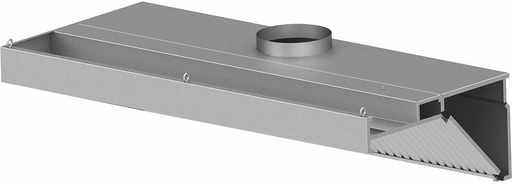 wykonanie ze stali nierdzewnej AISI 441 rynienka ociekowa z zaworem spustowym z bokami zabudowanymi do ustalenia liczba i rozmieszczenie króćców do montażu rur o średnicach: 100, 150, 160, 200, 250, 300, 315 mm brak wentylatora i zawiesi na wyposażeniu wersja z łapaczami tłuszczu okap w wersji bez oświetlenia LED
