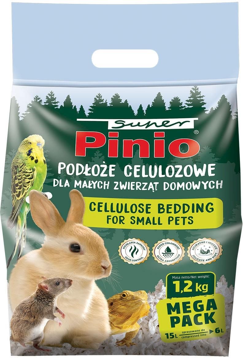 SUPER PINIO Podłoże celulozowe 1,2kg Podłoże celulozowe do klatek małych zwierząt domowych Dedykowane jest dla małych zwierząt domowych, takich jak: gryzonie, króliki, ptaki, płazy i gady. W 100% z celulozy! Jest miękkie i miłe w dotyku, dzięki czemu nie podrażnia wrażliwego ciała zwierząt. Produkt …