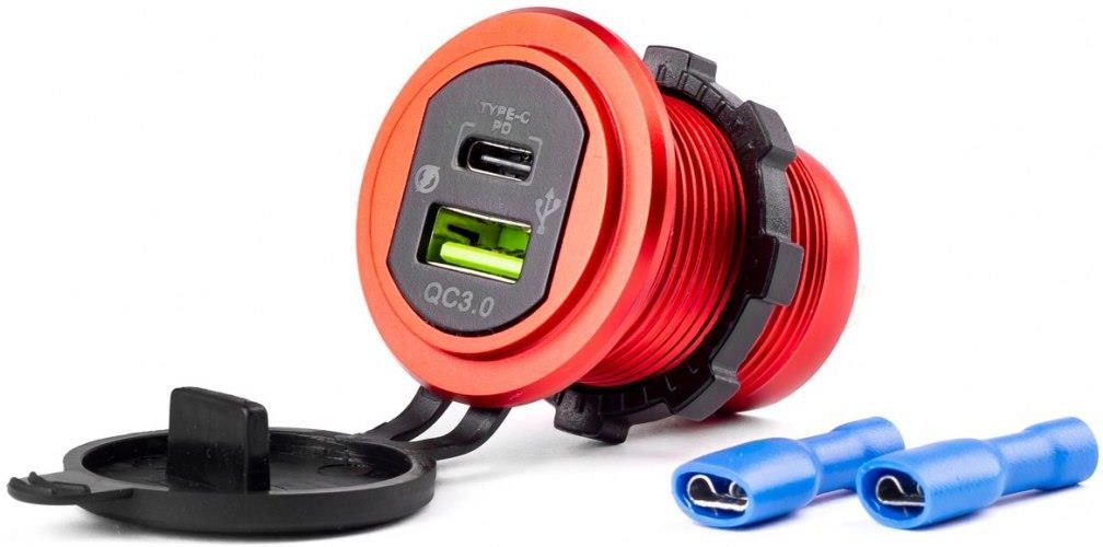 Wodoodporna szybka ładowarka w aluminiowej obudowie. Zastosowanie: motocykle, quady, łodzie, skutery, kampery, samochody osobowe oraz samochody ciężarowe, ciągniki i wiele innych Kolor podświetlenia - czerwony Ładowarka z portem USB szybkiego ładowania QC3.0 oraz portem USB-C PD 18W. Zestaw …