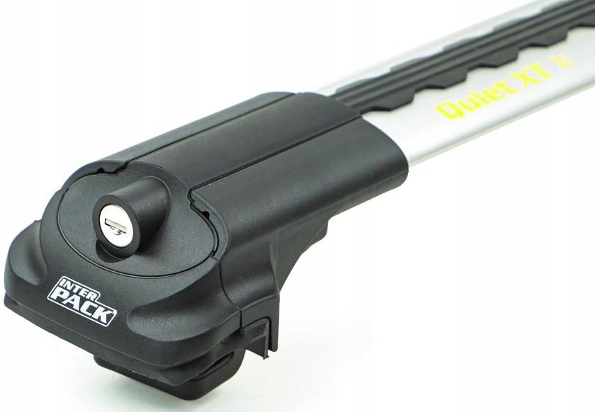 Bagażnik dachowy Inter Pack Quiet XT do samochodów wyposażonych w tradycyjne relingi dachowe. Nowoczesna konstrukcja wykorzystuje aluminiowe, aerodynamiczne belki, została zaprojektowana tak aby zminimalizować poziom hałasu i wpływ na zużycie paliwa. Dzięki niewielkiej wysokości oraz zakończeniom na relingach bagażnik bardzo elegancko prezentuje się na samochodzie, nie zaburzając bryły nadwozia. Aluminiowe belki zastosowane w tym modelu bagażnika posiadają aerodynamiczny przekrój dzięki czemu generują znacznie mniejszy hałas oraz ograniczają wzrost zużycia paliwa w porównaniu do typowych belek. Posiadają zintegrowany kanał montażowy o typowej szerokości 21 mm, umożliwiający montaż osprzętu różnych producentów (boxy, uchwyty rowerowe, uchwyty do nart itp.) za pomocą adapterów t-profil (tzw. wsuwek). W komplecie znajdują się także gumowe nakładki zakrywające kanał montażowy w każdej z belek. Dla zwiększenia poziomu ochrony mocowania do relingów zostały wyposażone w metalowe zamki zabezpieczające. Bagażnik Inter Pack Quiet XT jest całkowicie bezpieczny dla samochodu, wszelkie elementy mające styczność z relingami posiadają gumowe nakładki ochronne. Maksymalna ładowność bagażnika wynosi 75 kg (zalecamy sprawdzenie jaką ładowność dachu dopuszcza producent samochodu). Kompletny bagażnik składa się z zestawu mocowań oraz 2 belek o odpowiednio dobranej do samochodu długości. Uwaga - stosunkowo niewielka odległość belek od dachu sprawia, że w niektórych przypadkach podczas przewozu nart w uchwycie narciarskim wiązania mogą dotykać dachu - w takim wypadku należy stosować uchwyty posiadające opcję podwyższenia. Ostrożność należy zachować także przy otwieraniu szyberdachu, jeśli unosi się on do góry.