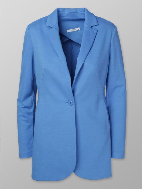 Niebieska marynarka damska o gładkiej fakturze bez kieszeni, zapinana na jeden guzik