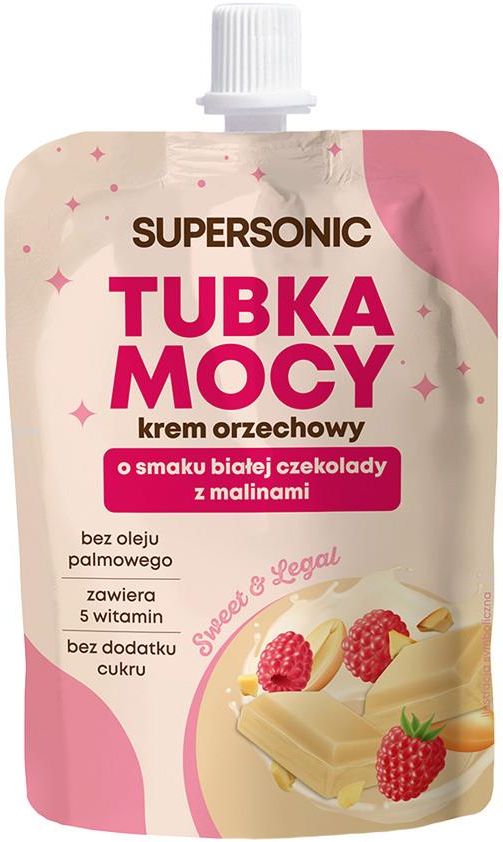 Supersonic Tubka Mocy krem orzechowy o smaku białej czekolady z malinami, 50 g – to środek spożywczy w formie funkcjonalnej przekąski, która łączy pyszny smak z wartością odżywczą. Stworzony na bazie naturalnych składników krem orzechowy zawiera białko, błonnik i 5 witamin, a jednocześnie nie zawiera dodatku cukru ani oleju palmowego. Delikatna biała czekolada przełamana nutą malin nadaje produktowi wyjątkowy, deserowy charakter, który docenią zarówno dorośli, jak i dzieci. Dzi