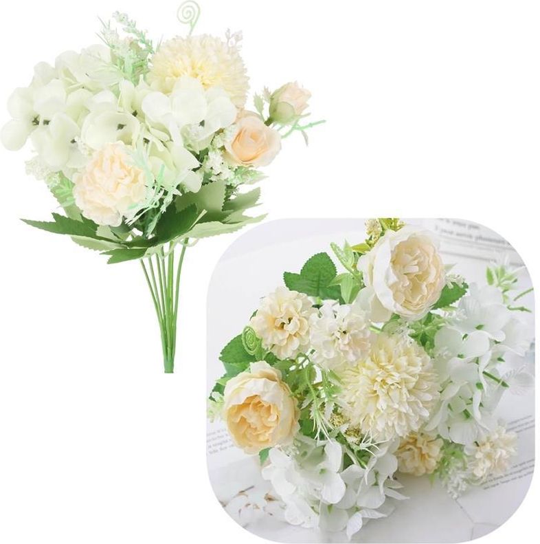 Bukiet sztucznych kwiatów w delikatnym odcieniu to kompozycja składająca się z 7 gałązek, na których znajdują się subtelne różyczki, hortensje, chryzantemy oraz starannie dobrane dodatki. Jest to doskonałe dopełnienie wystroju wnętrz. Kwiaty nie wymagają pielęgnacji, a mimo to przez długi czas wyglądają świeżo i pięknie. Można go wykorzystać do ozdabiania wnętrz domów, sal weselnych, restauracji czy biur, nadając im przytulny i elegancki wygląd. Można zestawiać je z innymi dekoracjami kwiatowymi lub wykorzystywać samodzielnie, tworząc zachwycające aranżacje. Wysokość bukietu: 32 cm Ilość gałązek: 7 Szerokość bukietu: ok. 20 cm Materiał: tworzywo sztuczne Bukiety mogą kolorystycznie i wizualnie nieznacznie odbiegać od tych przedstawionych na zdjęciach.