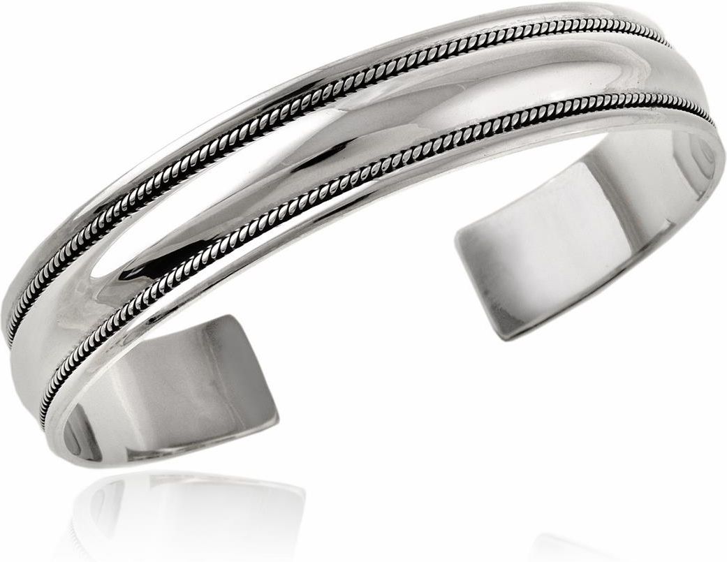 Bransoleta ze srebra próby 925 szeroka, ozdobiona ładnym wzorem przypominającym dwa sznurki. Nakłada się ją na nadgarstek przez lekkie rozchylenie jej końców. Bransoleta okazała i kobieca, pasuje na dużą rękę. Biżuteria łatwa w pielęgnacji, można stosować domowe sposoby czyszczenia srebra, np. szczoteczką do zębów z płynem do mycia naczyń.