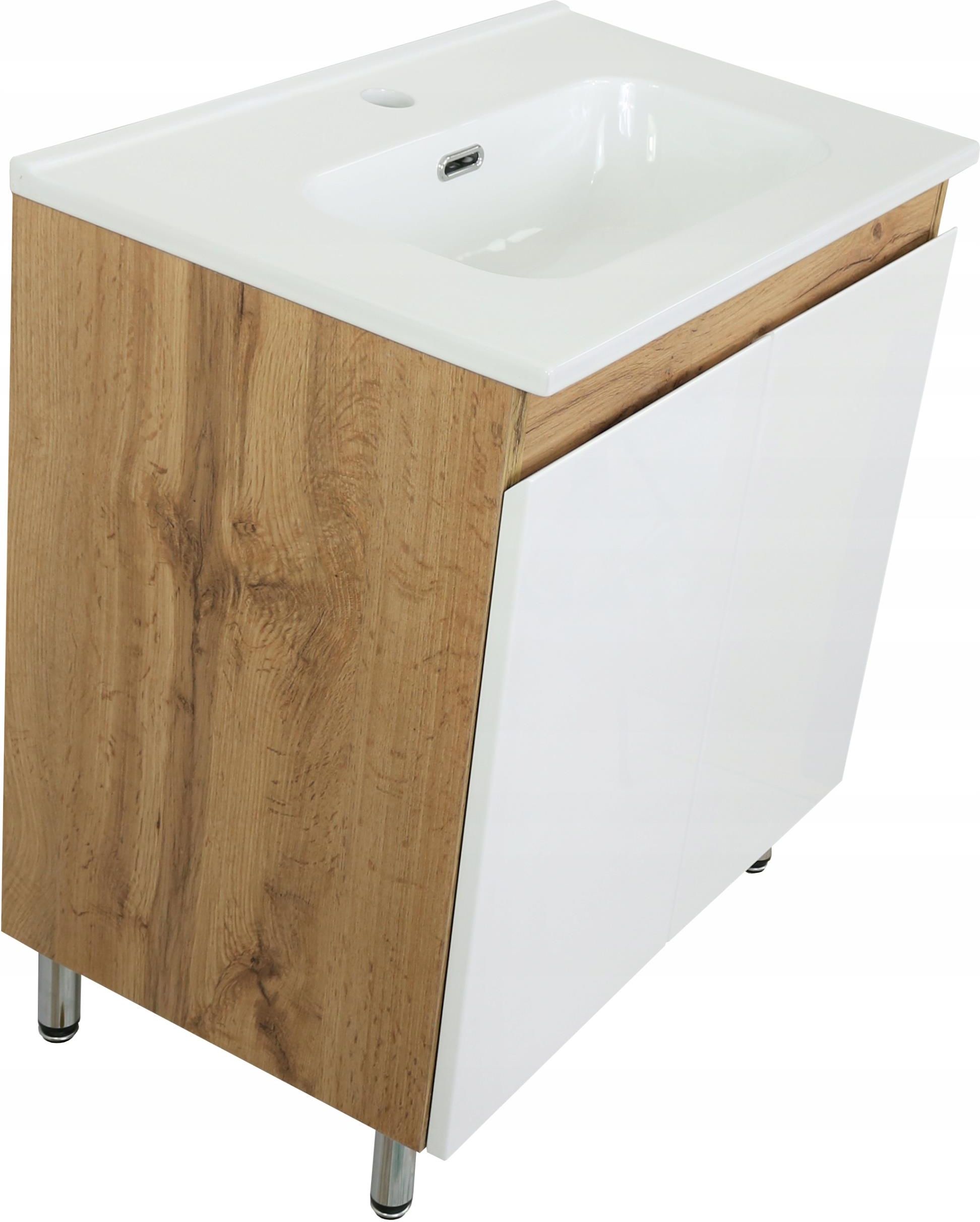 Stojąca szafka łazienkowa z umywalką ceramiczną. TREND WOTAN WHITE WS 60 Szafka wykonana z płyty laminowanej (matowej) w dekorze DĄB WOTAN. Fronty wykonane z płyty MDF, lakierowane na biały połysk, dzięki czemu są trwałe i odporne na szkodliwe działanie wody, oraz środków dezynfekcyjnych. Dwa efektowne frezowane uchwyty (skosy w górnej części frontów). Umywalka wykonana najwyższej jakości ceramiki, cechuje ją precyzja wykonania krawędzi oraz wyjątkowa wytrzymałość oraz odporność na zarysowania. Dzięki zastosowanej powłoce UP-CLEAN w łatwy sposób utrzymasz ją w czystości. W zestawie dodatkowa półka oraz 4 efektowne chromowane nóżki o wysokości 10 cm. Zawiasy z systemem cichego domykania, które sprawiają, że front w ostatniej fazie zamykania zwalnia, a następnie bezdźwięcznie się zamyka. Stosowane przez nas lakiery poliuretanowe charakteryzują się wysoką odpornością na wilgoć panującą w łazience - warto zwrócić na to uwagę podczas zakupu mebli łazienkowych, aby służyły wiele lat. Wymiary zestawu (łącznie z umywalką oraz nóżkami): Szerokość: 60 cm Wysokość: 85 cm Głębokość: 38,5 cm Na pozostałych aukcjach inne rozmiary oraz modele. Korpus szafki wykonany z płyty laminowanej w dekorze DĄB WOTAN. Fronty lakierowane na biały połysk. Efektowne frezowane uchwyty. UMYWALKA CERAMICZNA. Nowoczesna umywalka wykonana z wysokiej jakości ceramiki sanitarnej. Szerokość: 60 cm Głębokość: 38,5 cm Głębokość misy: 16 cm Kształt: Prostokątna Otwór na armaturę: Tak Przelew: Tak Materiał: Ceramika Zawartość przesyłki ELEMENTY DO ZŁOŻENIA SZAFKI INSTRUKCJA MONTAŻU umywalka paragon/faktura