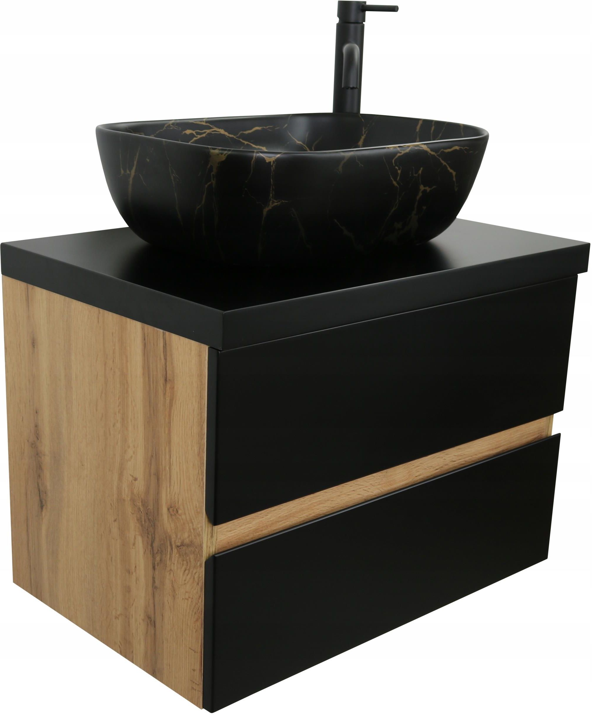 ZŁOŻONA SZAFKA ŁAZIENKOWA POD UMYWALKĘ Z CZARNYM, LAKIEROWANYM BLATEM. WOTAN WS 80 Nowoczesna, podwieszana szafka łazienkowa z blatem do zastosowania umywalki nablatowej. Blat wykonany z grubej płyty MDF (38 mm). Lakierowany na czarny mat. Idealnie sprawdzi się w każdej łazience jednocześnie nadając jej charakteru. Dwa efektowne uchwyty zintegrowane z frontem (skosy w dolnej części górnego frontu oraz w górnej części dolnego frontu). Dwie szuflady, prowadnice klasy PREMIUM (comfort box firmy REJS) z dożywotnią gwarancją. Systemem cichego domykania, który sprawia, że szuflada w ostatniej fazie zamykania zwalnia, a następnie bezdźwięcznie się zamyka. Fronty wykonane z płyty MDF, lakierowane na czarny mat. Boki szafki wykonane z płyty w dekorze DĄB WOTAN. Stosowane przez nas lakiery poliuretanowe charakteryzują się wysoką odpornością na wilgoć panującą w łazience - warto zwrócić na to uwagę podczas zakupu mebli łazienkowych, aby służyły wiele lat. Wymiary zestawu (łącznie z blatem) Szerokość: 80 cm Wysokość: 44 cm Głębokość: 40 cm Na pozostałych aukcjach inne rozmiary oraz modele. Fronty oraz blat lakierowany na czarny mat. Efektowne frezowane uchwyty. Lakier o głębokiej czerni z powłoką antyfinger, która minimalizuje widoczność odcisków palców, nadając ekskluzywny wygląd każdej łazience i ułatwiając utrzymanie czystości. System cichego domykania Prowadnice szuflad klasy PREMIUM (comfort box firmy REJS) z dożywotnią gwarancją. Zawartość przesyłki ZŁOŻONA szafka blat 80 cm x 40 cm x 4 cm zawieszki do powieszenia szafki paragon/faktura