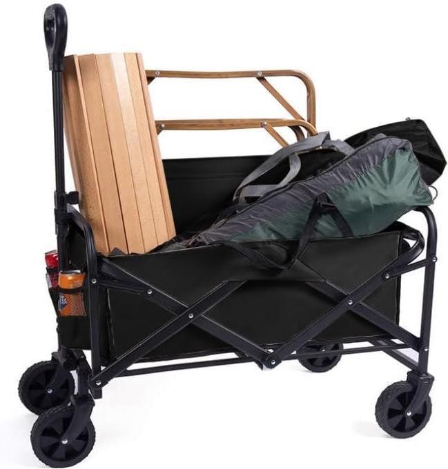 Wielozadaniowy wózek doskonale sprawdzi się do prac na działce, czy w ogrodzie, warto go również zabrać ze sobą na wakacje. Umożliwia transportowanie wszelkiego rodzaju niewielkiego ładunku. Dzięki skrętnym kołom o 360⁰ kierowanie i manewrowanie nim jest niezwykle proste. Wózek posiada wzmocnione, usztywnione dno, dzięki czemu transportowana zawartość utrzymuje się na swoim miejscu. Wykonany z metalowej ramy oraz wodoodpornego materiału, posiada wygodną rączkę ułatwiającą prowadzenie wózka. Największą zaletą jest możliwość składania i rozkładania w bardzo prosty sposób, z użyciem jednej ręki. Po złożeniu bez problemu zmieścimy go do bagażnika samochodu lub przechowamy na niewielkiej powierzchni. Dodatkowo wózek został wyposażony w kieszenie np. na napoje oraz łatwo dostępne uchwyty do jego przenoszenia w pozycji złożonej. Kolor: czarny Wymiar rozłożonego: 76 (szer.) x 48 (gł.) x 48 (wys.) cm Głębokość wózka: 26 cm Wymiar złożonego: 65 (szer.) x 48 (gł.) x 12 (wys.) cm Długośc rączki: 65 - 90 cm Szerokość rączki: 18 cm Średnica kół: 12 cm