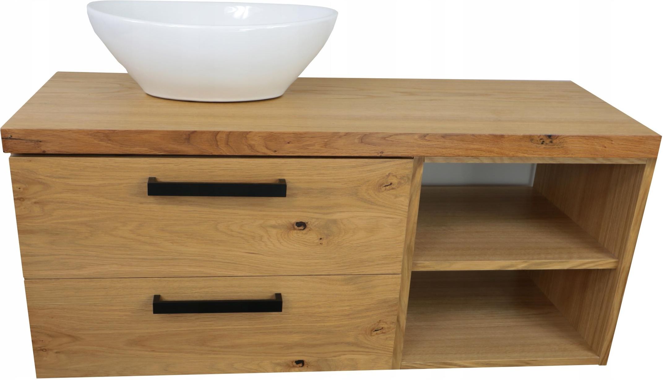 Podwieszany zestaw łazienkowy z blatem fornirowanym naturalnym dębem. CRAFT W2 120 Nowoczesna, podwieszana szafka łazienkowa z blatem, do zastosowania umywalki nablatowej. Blat fornirowany naturalnym dębem. Powierzchnia obustronnie pokryta olejem w celu zabezpieczenia przed wilgocią. Wykonany z grubej i trwałej płyty (38mm). Idealnie sprawdzi się w każdej łazience jednocześnie nadając jej charakteru. Dwa metalowe uchwyty (czarny mat). Dwie szuflady, prowadnice klasy PREMIUM (comfort box firmy REJS) z dożywotnią gwarancją. Systemem cichego domykania, który sprawia, że szuflada w ostatniej fazie zamykania zwalnia, a następnie bezdźwięcznie się zamyka. Otwarta część zestawu z ruchomą, lakierowaną półką pozwoli na szybki dostęp do przechowywanych tam rzeczy. Cały zestaw (boki, fronty, półki) wykonany z płyty pokrytej naturalnym fornirem dębowym - dodatkowo lakierowany. Stosowane przez nas lakiery poliuretanowe charakteryzują się wysoką odpornością na wilgoć panującą w łazience - warto zwrócić na to uwagę podczas zakupu mebli łazienkowych, aby służyły wiele lat. W górnej szufladzie wycięcie wraz z osłonką na odpływ umywalki. Wymiary zestawu (łącznie z blatem) Szerokość 120 cm (dwie szafki): 80 cm (szafka z szufladami) + 40 cm (otwarta szafka z półkami) Wysokość: 44 cm Głębokość: 40 cm Na pozostałych aukcjach inne rozmiary oraz modele. System cichego domykania Prowadnice szuflad klasy PREMIUM (comfort box firmy REJS) z dożywotnią gwarancją. Zawartość przesyłki dwie ZŁOŻONE szafki blat 120 cm dwa uchwyty zawieszki do powieszenia szafki paragon/faktura