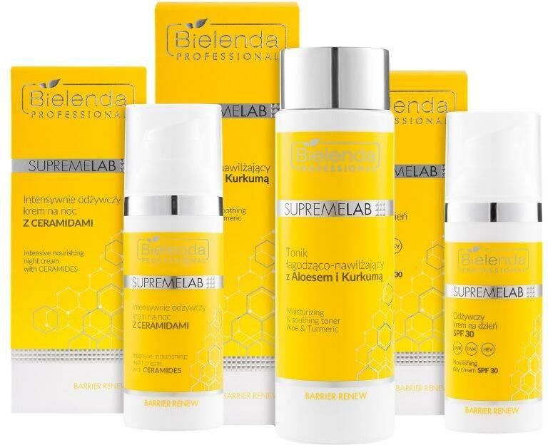 Bielenda Professional Supremelab Barrier Renew Zestaw pielęgnacyjny do twarzy Tonik + Krem Dzień SPF i Noc W skład zestawu pielęgnacyjnego wchodzą: Bielenda Professional Supremelab Barrier Renew Odżywczy krem na dzień SPF 30 50ml Bielenda Professional Supremelab Barrier Renew Intensywnie odżywczy Krem na Noc z Ceramidami 50ml Bielenda Professional Supremelab Barrier Renew Tonik łagodząco-nawilżający 200ml Bielenda Professional Supremelab Barrier Renew Odżywczy krem na dzień SPF 30 50ml Supremelab odżywczy krem Barrier Renew idealny do stosowania na dzień – zapewnia intensywne nawilżenie, odżywienie, a także ochronę nie tylko przed promieniami UV, ale także Blue light (HEV). Chroniąc przed szkodliwym działaniem promieniowania UV, przeciwdziała przedwcześnie pojawiającym się efektom starzenia się skóry. Skóra wymagająca silnego nawilżenia jest nawodniona i doskonale chroniona przed niekorzystnym wpływem promieniowania. Bielenda Professional Supremelab Barrier Renew Intensywnie odżywczy Krem na Noc z Ceramidami 50ml Krem zapewnia głęboką odnowę i regenerację. Cera staje się nawilżona, miękka, sprężysta, ukojona i bardziej odporna na działanie czynników zewnętrznych. Kondycjonuje suchą skórę. Krem wspiera nocną regenerację, dzięki czemu rano cera pozostaje promienna i świeża. To przyjemny krem o bogatej formule nawilżająco-odżywczej. Ma ładny zapach.. To treściwy krem na noc, który nawilża cerę i chroni ją przed przesuszeniem, co jest przyczyną przedwczesnego starzenia się skóry. Rewelacyjny kosmetyk do pielęgnacji każdego rodzaju skóry. Wspiera cerę suchą i świetnie nawilża. Jego konsystencja jest przyjemna w użyciu. Ten cudowny krem do twarzy przypadnie do gustu naprawdę wielu. Bielenda Professional Supremelab Barrier Renew Tonik łagodząco-nawilżający 200ml Delikaty tonik łagodząco-nawilżający z Aloesem i Kurkumą, który przywraca skórze odpowiednie pH, łagodzi i dba o optymalne nawilżenie. Zawiera składniki znane ze swojego dobroczynnego, regenerującego działania. Przywraca skórze odpowiednie pH, łagodzi i dba o optymalne nawilżenie. Zawiera składniki znane ze swojego dobroczynnego, regenerującego działania. Tonik wzmacnia barierę ochronną naskórka, zapewnia optymalny poziom nawilżenia i zabezpiecza skórę przed nadmierną utratą wody.