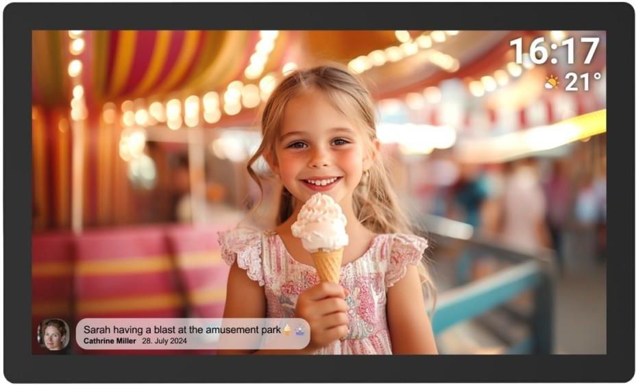 DENVER PFF-3260 Cyfrowa ramka na zdjęcia z oprogramowaniem FRAMEO 32" FULL HD Przeżyj wspomnienia w jakości Full HDCyfrowa ramka do zdjęć DENVER PFF-3260 ożywi Twoje cenne wspomnienia dzięki oszałamiającemu 32-calowemu ekranowi dotykowemu Full HD IPS. Przeżyj swoje ulubione chwile w ostrych, żywych szczegółach.Połącz się i udostępniaj natychmiastDzięki wstępnie zainstalowanemu oprogramowaniu FRAMEO udostępnianie zdjęć i filmów jest dziecinnie proste. Wystarczy pobrać aplikację na smartfon i przesłać zawartość bezpośrednio do ramkiElegancki design, bezproblemowa kontrolaRamka elegancko uzupełnia każdy wystrój, a intuicyjny ekran dotykowy zapewnia łatwą nawigację i kontrolę nad galerią cyfrową. Dużo miejsca na Twoje wspomnieniaNie martw się już o miejsce dzięki dużej pamięci wewnętrznej ramki o pojemności 32 GB oraz gniazdu na kartę MicroSD na dodatkową pamięć.Inteligentne funkcje do codziennego użytkuUstaw ramkę tak, aby wyłączała się automatycznie za pomocą funkcji timera i ciesz się obracającym się wyświetlaczem zdjęć z interwałami od 10 sekund do 30 minut. Aplikacja Frameo umożliwia udostępnianie zdjęć najbliższym. Można przesyłać zdjęcia bezpośrednio ze smartfonu do cyfrowej ramki Frameo, aby udostępnić znajomym i rodzinie zapoznanie się z ważnymi wydarzeniami. Do zdjęcie można dodać podpis, aby opisać swoje przeżycia! Korzystając z tej aplikacji, można wysyłać zdjęcia do wszystkich swoich podłączonych ramek Frameo niezależnie od lokalizacji. Zdjęcia są wyświetlane już po kilku sekundach, dlatego można informować o wydarzeniach na bieżąco. Do każdej ramki możesz stworzyć grupę znajomych, aby nawzajem wysyłać sobie różne zdjęcie lub życzenia urodzinowe. Po przez aplikację FRAMEO możesz tworzyć krótkie filmiki które również można wysłać na swoją ramkę lub znajomej osoby. Ramka Frameo to prezent na różne okoliczności. Podaruj ją bliskim i znajomym. Bądź w stałym kontakcie, nawet jeśli w tym szczególnym dniu nie możecie być razem, pokaż mi że o nich pamiętasz. Funkcja reakcjiDzięki reakcjom Twoi bliscy dowiedzą się, co sądzisz o ich najnowszych zdjęciach i filmach dzięki reakcjom wysyłanym bezpośrednio do ramki. Funkcja zegara i prognozy pogodyRamka posiada funkcję zegara i prognozy pogody. Aplikacji Frameo jest kompatybilna z system iOS lub Android. Aby wysyłać zdjęcia na swoją ramkę, użyj aplikacji frameo dla systemu iOS lub Android. Parametry techniczne :32-calowy ekran dotykowy FULL HD IPSPołączenie Wi-Fi 2,4 GHz32 GB pamięci wewnętrznej1 GB pamięci RAMGniazdo karty MicroSDpreinstalowane oprogramowanie FRAMEO do przesyłania zdjęć i filmów ze smartfonapełna kontrola nad wyświetlaczem, możliwość dodawania i usuwania znajomych bezpośrednio z ekranu dotykowegoFunkcja timera umożliwiająca automatyczne wyłączenie ramki FRAMEO w nocymożliwość ustawienia interwału wymiany obrazu w zakresie 10 sek. i 30 minut.możliwość dodawania tekstu do obrazkówłatwy w użyciuWejście USB-Czasilacz 230V~50Hz AC/DCakcesoria: uchwyt VESA 100Wymiary: 76,5 x 4 x 45,7 cm (szer . x gł. x wys.)
