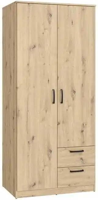 Szafa ubraniowa NIKO NIKS81 Szafa na ubrania NIKO marki FORTE jest na tyle uniwersalna, że będzie dobrze wyglądać zarówno ustawiona w przedpokoju, salonie, sypialni, pokoju młodzieżowym, jak i w biurze. Ten niepozorny mebel daje bardzo duże możliwości aranżacyjne. Szafa jest pojemna, ma dwie szuflady w części dolnej oraz drążek na wieszaki i półkę nad nim. Mając taki mebel, nie będziesz mieć problemu z segregacją odzieży. Co więcej, do kompletu możesz dobrać komodę z tej samej serii, dzięki czemu uda Ci się stworzyć spójny, harmonijny wystrój wnętrza. Szafa na ubrania NIKO o wymiarach 82 x 185 x 53 cm doskonale sprawdzi się szczególnie w małych pomieszczeniach, gdzie każdy centymetr jest na wagę złota. Mebel ma prostą konstrukcję, jest wykonany bardzo solidnie i ma uniwersalną kolorystykę. Te cechy sprawiają, że będzie pasować zarówno do nowoczesnych, jak i klasycznych aranżacji. W ofercie naszego sklepu znajdziesz stylowe, solidne wyposażenie marki FORTE, która cieszy się bardzo dużym zainteresowaniem ze strony naszych klientów. Zapraszamy na zakupy. Cechy kolekcji ForQuick to ekonomiczna propozycja kompletu mebli do pokoju dziennego, młodzieżowego, sypialni, biura oraz przedpokoju. Wzornictwo oparte na współczesnych trendach oraz funkcjonalne bryły pozwalają na szybkie i niedrogie aranżowanie zarówno małych jak i większych pomieszczeń. W ofercie ForQuick znajduje się również wiele praktycznych i tanich rozwiązań przechowywania i porządkowania. Szeroki asortyment oraz uniwersalne wzronictwo systemu NIKO umożliwi aranżację salonu, sypialni, pokoju młodzieżowego, biura oraz garderoby. Szafa posiada w środku drążek oraz półkę nad nim i dwie szuflady w części dolnej. Meble przygotowane do samodzielnego montażu. Wymiary szafy Szerokość: 82 cm Wysokość: 185 cm Głębokość: 53 cm Dostępny kolor Dąb Artisan