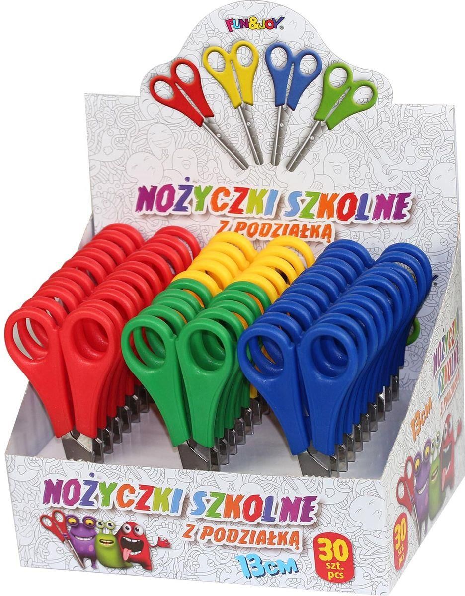 Nożyczki Fun&Joy z podziałką 13cm to nieoceniony narzędzie w codziennej pracy biurowej, szkolnej czy rękodzielniczej. Wykonane z wysokiej jakości stali nierdzewnej zapewniają precyzyjne cięcie bez ryzyka zacinania czy sklejania papieru. Ergonomiczny uchwyt z podziałką 13 cm gwarantuje wygodne i precyzyjne użytkowanie. Niezbędne narzędzie w każdym biurze czy pracowni!Nożyczki szkolne z podziałką zaokrąglone końce, długość ostrza: 58 mm, długość nożyczek: 130 mm. Kolory wysyłamy losowo.