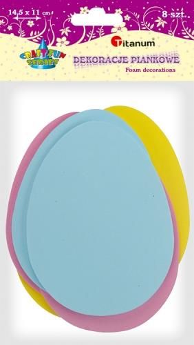 - miękkie dekoracje z pianki - kształt jajka - 8 szt. Mogą zostać użyte jako samodzielne ozdoby lub stanowić element zdobniczy przy tworzeniu kartek okolicznościowych, zaproszeń, pamiętników, albumów, pakowaniu prezentów, tworzeniu dekoracji świątecznych, jak i zdobieniu wnętrz, np. dziecięcych pokojów czy sal przedszkolnych.