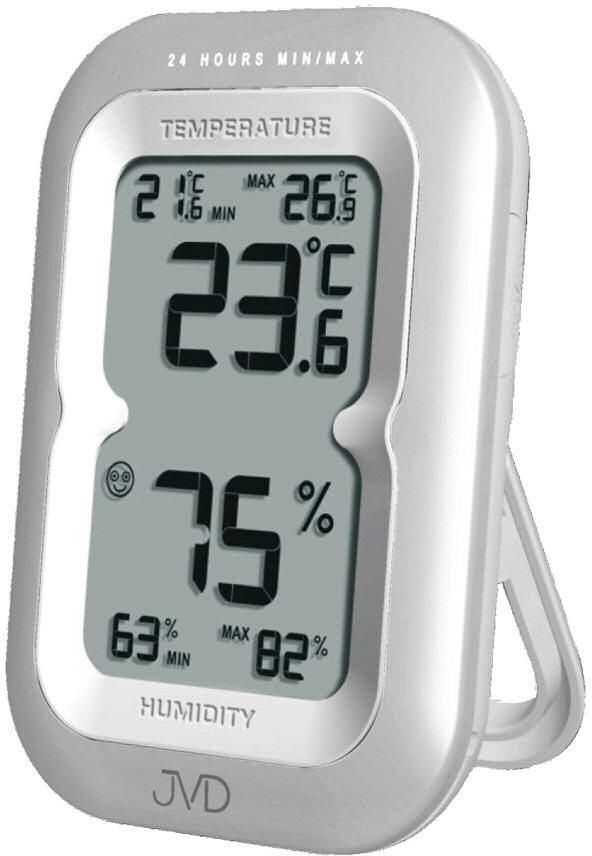 TOWARY NA NASZYCH AUKCJACH SĄ NOWE I NIEUŻYWANE NA TEJ AUKCJI OFERUJEMY Termometr Higrometr JVD T9230.2 Pamięć Alarmy Marka / producent: JVD Model: T9230.2 Termometr i higrometr cyfrowy T9230.2 firmy JVD. Pomiar temperatury i wilgotności. Pamięć temperatury i wilgotności. Alarmy temperatury i wilgotności. Wskaźnik komfortu ZEGARY - KOLOR: srebrny ZEGARY - KSZTAŁT: prostokątny, owalny ZEGARY - MATERIAŁ: tworzywo sztuczne ZEGARY - RODZAJ: elektroniczny ZEGARY - TYP: stojący, wiszący ROZMIAR (tylko ścienne): mały - do 27 cm POMIARY: temperatura, wilgotność ZASILANIE: bateryjne DANE TECHNICZNE POMIAR WILGOTNOŚCI zakres pomiaru: od 20 do 95% jednostka pomiaru: 1% POMIAR TEMPERATURY zakres pomiaru od -10 do +50 stopni C jednostka pomiaru: 0,1 stopni C (0,2 stopnia F) PAMIĘĆ POMIARÓW wyświetlanie minimalnych i maksymalnych wartości temperatury i wilgotności zarejestrowanych w ciągu ostatnich 24 godzin ALARMY TEMPERATURY I WILGOTNOŚCI możliwość ustawienia alarmów dla zadanych wartości temperatury i wilgotności alarm załącza się gdy temperatura lub wilgotność spadnie poniżej ustawionej wartości (wartości dolne) lub wzrośnie powyżej (wartości górne) czas trwania alarmu - 2 minuty WSKAŹNIK KOMFORTU - 4 IKONY COLD - zimno COMFORT - idealny zakres temperatury i wilgotności HOT - gorąco VERY HOT - bardzo gorąco MOŻLIWOŚĆ MONTAŻU otwór do powieszenia na ścianie rozkładana podstawka ZASILANIE 2 baterie LR03 (AAA) WYMIARY 72 mm x 104 mm x 18 mm [szer x wys x gł] Każdy sprzedawany produkt jest w fabrycznym opakowaniu producenta