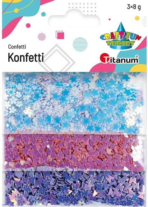 - Wzory:- kwiaty wiśni 5x5mm perłowe- serca 3x3mm różowe- motyle 4x4mm fioletowe- Ilość: 3 x 8 g- Doskonałe do dekoracji, prac plastycznych i zabaw kreatywnych
