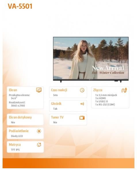 55-calowy wyświetlacz do cyfrowej sygnalizacji 4K UHD z cienką ramką VA5501 to 55-calowy wyświetlacz Digital Signage 4K UHD z cienką ramką, zaprojektowany z myślą o zastosowaniu w biznesie, handlu detalicznym, hotelarstwie i edukacji. Dzięki rozdzielczości 4K, jasności 350 nitów i szerokiemu kątowi widzenia 178°, zapewnia ostre, wyraziste obrazy. Trzy wejścia HDMI, sterowanie RS232 i funkcje automatycznego harmonogramowania gwarantują płynną łączność i efektywne zarządzanie treścią. Elegancka, cienka ramka doskonale komponuje się z każdym otoczeniem, oferując jednocześnie długoterminową niezawodność. Solidny system DMS upraszcza zarządzanie wieloma ekranami, co czyni go idealnym wyborem do zastosowań Digital Signage, prezentacji i wyświetlania treści promocyjnych. Elegancki i nowoczesny design z wąską ramką VA5501 wyposażony jest w ultra-wąską ramkę o szerokości 1,5 mm, która zapewnia elegancki i profesjonalny wygląd, pasujący do każdego środowiska. Jego minimalistyczna ramka maksymalizuje przestrzeń ekranu, oferując wciągające wrażenia wizualne i bezproblemową integrację w środowiskach detalicznych, biznesowych i publicznych, zachowując przy tym czysty, współczesny wygląd. Imponująca rozdzielczość 4K Ciesz się wyjątkową klarownością i realistycznymi detalami dzięki rozdzielczości 4K Ultra HD w VA5501, która zapewnia wyraźne, żywe obrazy, idealne do imponujących prezentacji i angażującej reklamy cyfrowej. Żywe i wyraźne w każdych warunkach oświetleniowych Dzięki jasności 350 nitów wyświetlacz zapewnia wyraźne i żywe obrazy w różnych środowiskach - od centrów handlowych po holach, salach kontrolnych i inne. Stała jakość obrazu pod każdym kątem Dzięki szerokiemu kątowi widzenia ten monitor zapewnia jednolite kolory i ostre detale z niemal każdej perspektywy - niezależnie od tego, czy jest oglądany z góry, z dołu, z przodu czy z boku. Patenteowana technologia ANTI-BURN-IN Aby rozwiązać problem wypalania obrazu lub zjawiska ghostingu w tradycyjnych ekranach LCD, AG Neovo wykorzystuje swoją opatentowaną technologię Anti-Burn-in, która pomaga zapobiegać retencji obrazu i wydłuża żywotność wyświetlacza. Zintegrowane głośniki dualne VA5501 jest wyposażony w zintegrowane głośniki 5W, które zapewniają wsparcie audio dla treści multimedialnych. Bezproblemowe zarządzanie zdalne na wielu urządzeniach Neovo Controller upraszcza sterowanie wyświetlaczem za pomocą intuicyjnego interfejsu, umożliwiając łatwe zarządzanie zdalne na platformach macOS i Windows dla spersonalizowanego i wydajnego doświadczenia użytkownika. Centralne zarządzanie z elastyczną łącznością Łatwo zintegrować wyświetlacz w swojej zarządzanej sieci przy użyciu poleceń I/O, z portami USB, RS232 i trzema wejściami HDMI, które zapewniają płynne i elastyczne połączenie. Informacje o produkcie Etykieta energetyczna Pobierz Model VA-5501 Proporcje obrazu 16:9 Przekątna ekranu 54.6" Typ matrycy TFT IPS (IPS) Powierzchnia matrycy Matowa Ekran dotykowy Nie Technologia podświetlania Diody LED Plamka matrycy 0.315 mm Rozdzielczość 3840 x 2160 (4K/UHD) Czas reakcji 5 ms Jasność 350 cd/m² Kontrast statyczny 1 200:1 Częstotliwość pozioma min. 31 kHz Częstotliwość pozioma max. 136 kHz Częstotliwość pionowa min. 29 Hz Częstotliwość pionowa max. 61 Hz Kąt widzenia poziomy 178 ° Kąt widzenia pionowy 178 ° Ilość kolorów 1,07 mld Gniazda we/wy 1 x 3,5 mm minijack 3 x HDMI 1 x USB 2.0 1 x RS-232 (COM) Kensington Security Slot Tak Bluetooth Nie WiFi Nie Wbudowane głośniki Tak Wbudowany tuner TV Nie Kamera internetowa Brak Pivot Nie Regulacja wysokości Nie Certyfikaty WEEE EAC LVD REACH RoHS UKCA CE Standard VESA 200 x 100 Pobór mocy 80 W Klasa energetyczna G Akcesoria w zestawie Baterie Kabel HDMI Przewód zasilający Przewodnik szybkiego uruchomienia Pilot zdalnego sterowania Kolor Czarny Wysokość 720.3 mm Wysokość z podstawą 739.5 mm Szerokość 1226.8 mm Głębokość 85.3 mm Głębokość z podstawą 293.2 mm Waga 10.5 kg Waga z podstawą 10.7 kg Oznaczenia