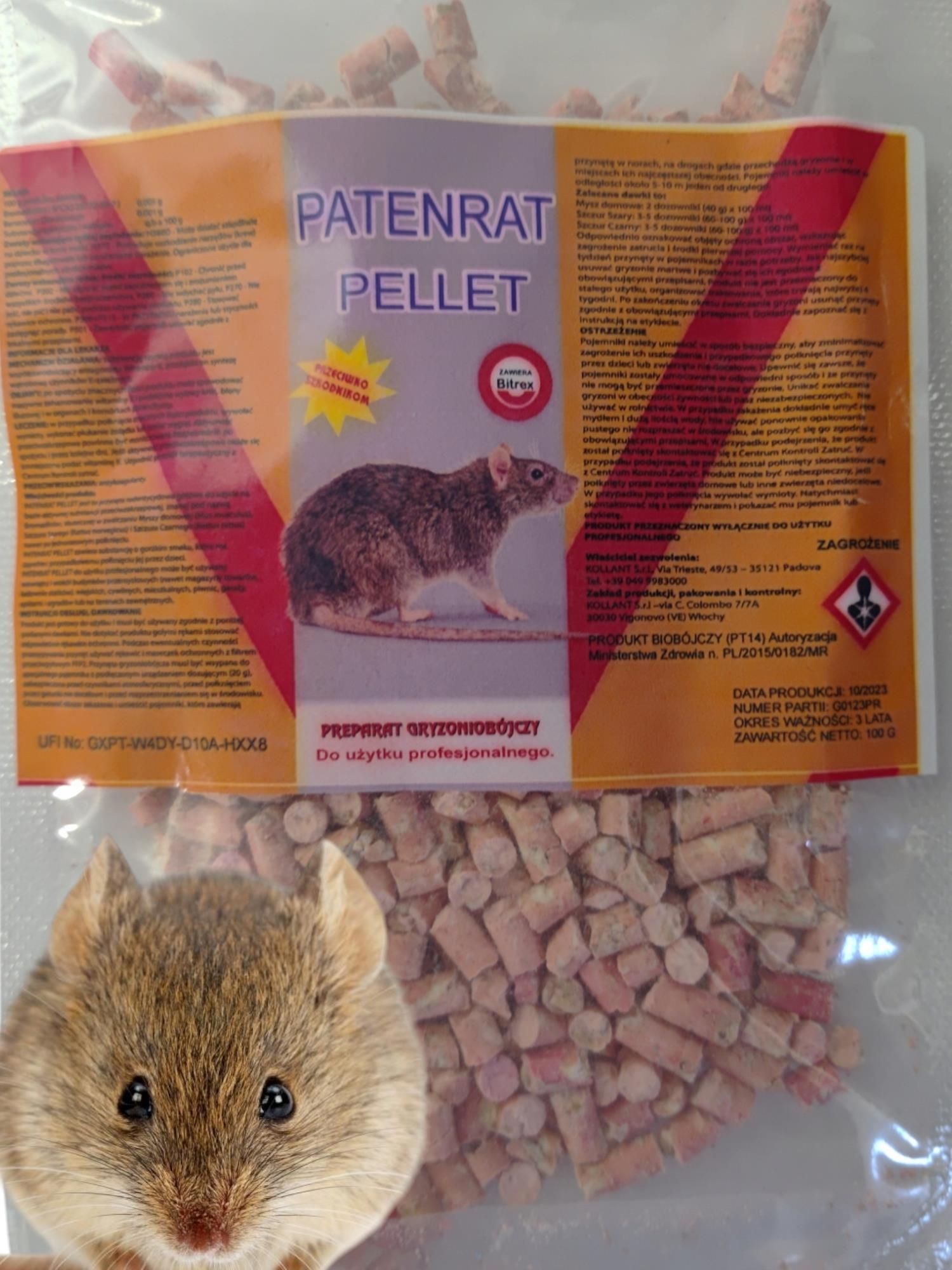 AKAJ to szybka dostawa. 「 ✦ AKAJ ✦ 」 BARDZO SILNA TRUTKA NA SZCZURY I MYSZY GRANULAT 100g GRYZONIOBÓJCZA do zwalczania gryzoni. Dlaczego warto kupić BARDZO SILNĄ TRUTKĘ NA SZCZURY I MYSZY GRANULAT 100g - Środek gryzoniobójczy -odporna na wilgoć - granulat -skutecznie wabi gryzonie - idealnie nadaję się do zwalczania gryzoni wewnątrz oraz wokół obiektów przemysłowych, w gospodarstwach rolnych - używana przez profesjonalistów SPECYFIKACJA Substancja czynna: Bromadiolone 0,005% Zwalczanie myszy wewnątrz i wokół budynków: wykładać 40g przynęty w karmniku deratyzacyjnym . Zwalczanie szczurów wewnątrz i wokół budynków: wykładać 60-100g przynęty w karmniku deratyzacyjnym. Jeżeli wymagana jest więcej niż jedna stacja deratyzacyjna, minimalna odległość pomiędzy stacjami powinna wynosić 5m. Opakowanie 100g. Trucizna jest zabezpieczona przed przypadkowym spożyciem przez ludzi i zwierzęta domowe dzięki gorzkiej substancji (Britex). Granulat należy wykładać w rękawicach ochronnych w miejscach występowania gryzoni, w pobliżu ich kryjówek oraz na drogach ich przebiegu z zachowaniem zasad bezpieczeństwa i higieny. DOŁĄCZ DO ZADOWOLONYCH KLIENTÓW FIRMY AKAJ!