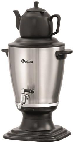 Samowar elektryczny 3,2 l - B-191004 Samowar marki Bartscher pozwoli nie tylko na zagotowanie wody i zaparzenie herbaty, ale także utrzymanie ich w cieple. Sprawdzi się doskonale w warunkach domowych oraz w pensjonatach, gospodarstwach agroturystycznych czy lokalach retro. Urządzenie posiada certyfikat CE i spełnia wymagania Sanepidu. Wykonanie Samowar wykonany został z trwałej a przy tym łatwej w czyszczeniu stali szlachetnej oraz wytrzymałego tworzywa sztucznego. Po bokach obudowy umieszczono duże nienagrzewające się uchwyty. Zbiornik umożliwia zagotowanie 3,2 l wody. W zestawie znajduje się fajansowy dzbanek o pojemności 0,8 l wyposażony w filtr siatkowy. Podgrzewanie Oferowany samowar wyposażono w wydajny element grzewczy o mocy 2000 W, co pozwala na szybkie zagotowanie wody oraz w razie potrzeby podtrzymanie jej temperatury. Dzięki umieszczeniu dzbanka na wkładzie parowym, również esencja herbaciana zachowa odpowiednią temperaturę. O nagrzewaniu urządzenia oraz uruchomieniu funkcji podtrzymania temperatury informują lampki kontrolne. Specyfikacja Artykuł: Samowar 3,2L Nr katalogowy: B-191004 Stan artykułu: Nowy Zasilanie: 230 V Moc: 2000 W Materiał wykonania: Stal szlachetna, tworzywo sztuczne Pojemność: 3,2 l Materiał dzbanka: Fajans Pojemność dzbanka na esencję: 0,8 l Funkcja automatycznego wyłączania: Tak Funkcja podtrzymania temperatury: Tak Zabezpieczenie przed przegrzaniem: Tak Wymiary (SxGxW): 27,4 x 27,4 x 49,5 cm Waga: 2,2 kg W skład zestawu wchodzą Samowar Dzbanek na esencję z filtrem siatkowym Instrukcja obsługi